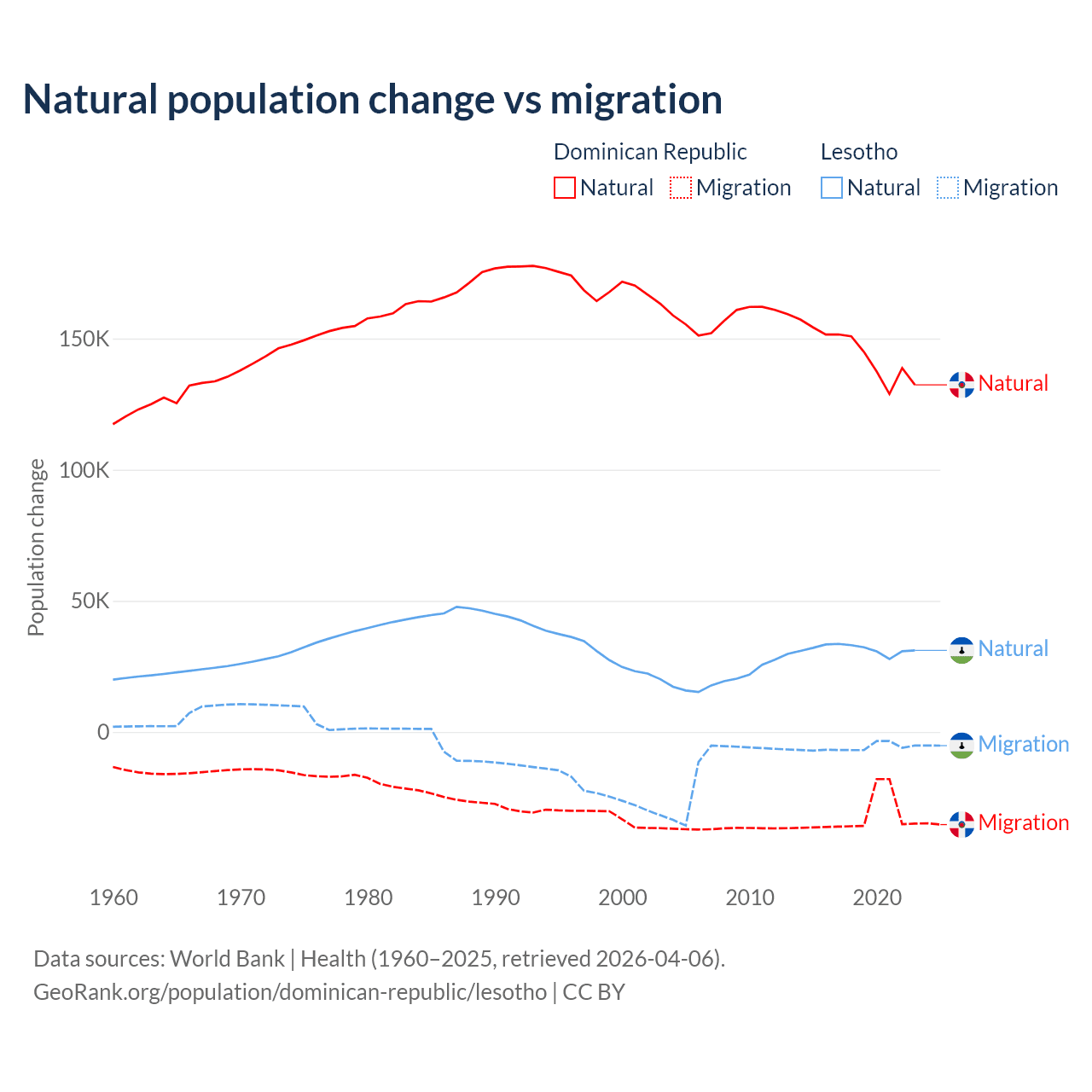Over the last 10 years, 81.8% of the population change in the Dominican Republic is from natural causes (a gain of 1,447,764 people) and 18.2% is from migration (a loss of 322,919 people). In Lesotho 84.2% is from natural causes (a gain of 315,836 people) and 15.8% is from migration (a loss of 59,457 people).