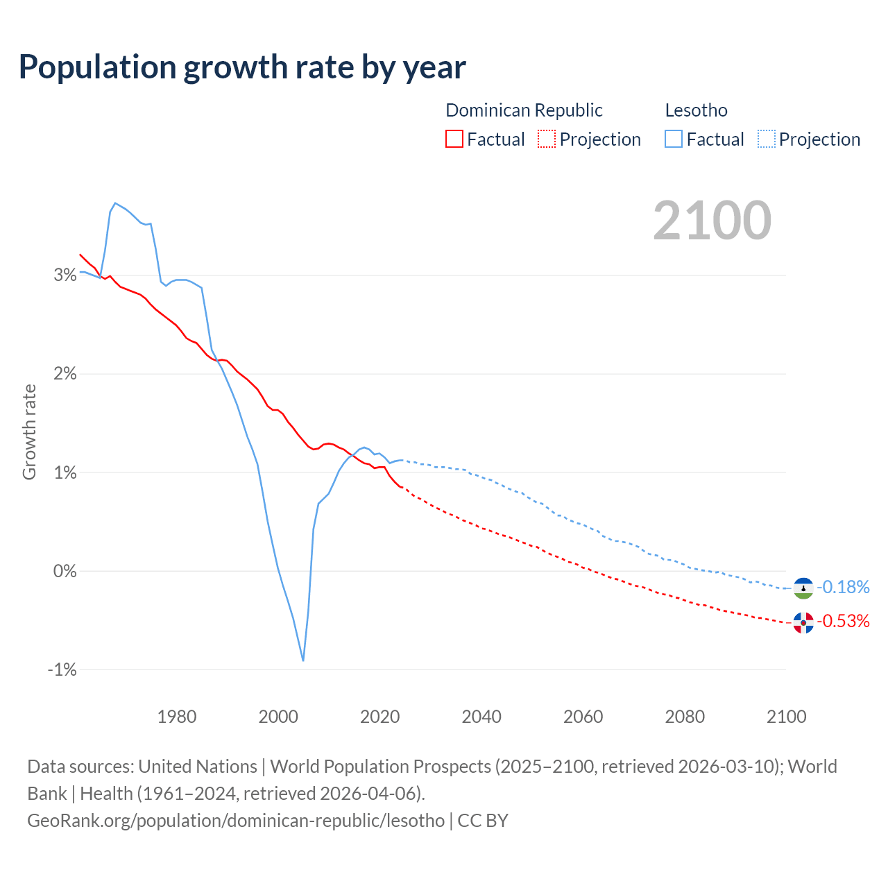 - For the last 10 years, the Dominican Republic has had an average growth rate of +1.04% per year vs +1.17% in Lesotho.