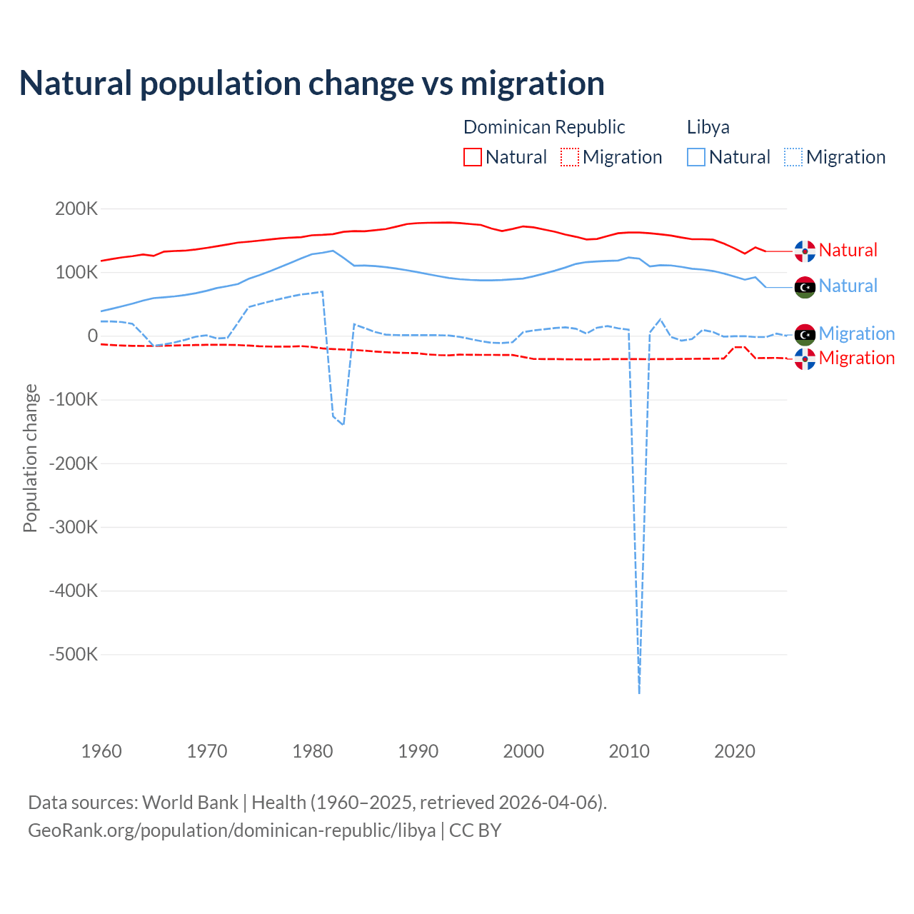 Over the last 10 years, 81.8% of the population change in the Dominican Republic is from natural causes (a gain of 1,447,764 people) and 18.2% is from migration (a loss of 322,919 people). In Libya 99.4% is from natural causes (a gain of 975,799 people) and 0.63% is from migration (a loss of 6,150 people).