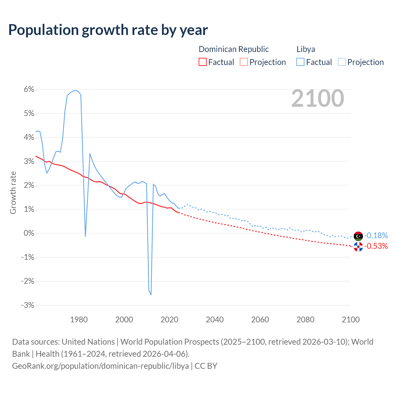 - For the last 10 years, the Dominican Republic has had an average growth rate of +1.04% per year vs +1.44% in Libya.