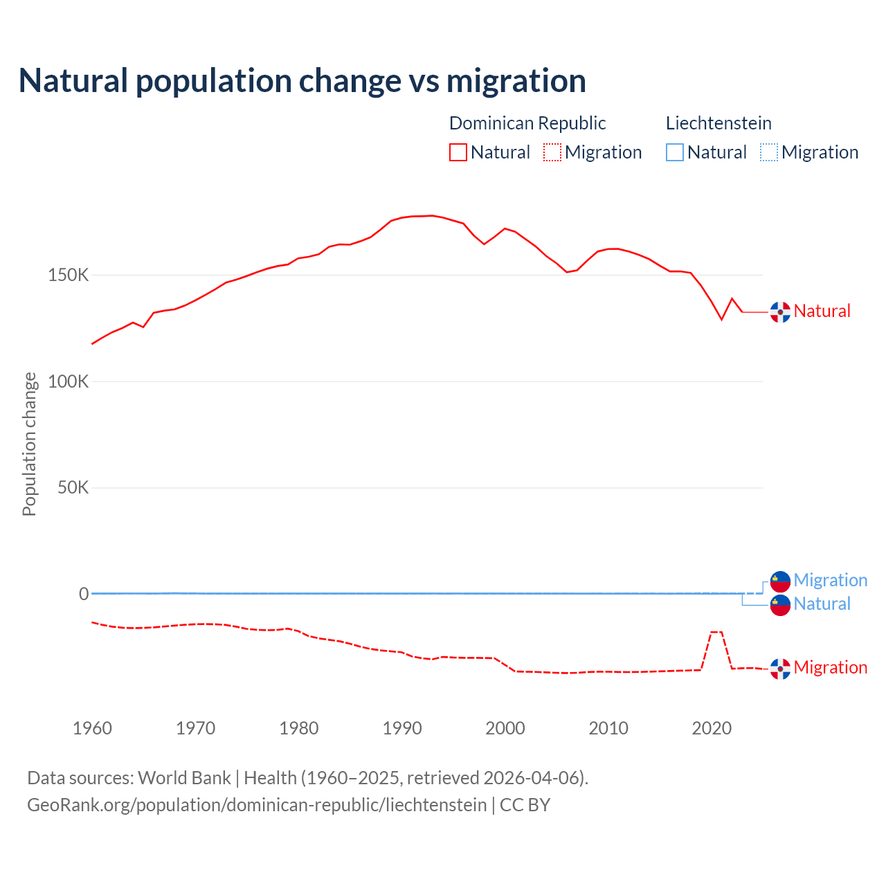 Over the last 10 years, 81.8% of the population change in the Dominican Republic is from natural causes (a gain of 1,447,764 people) and 18.2% is from migration (a loss of 322,919 people). In Liechtenstein 32.4% is from natural causes (a gain of 883 people) and 67.6% is from migration (a gain of 1,843 people).