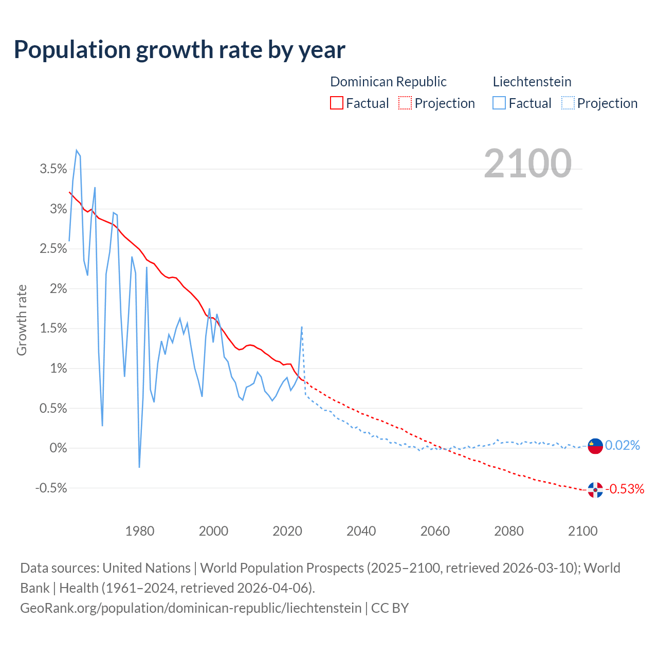 - For the last 10 years, the Dominican Republic has had an average growth rate of +1.04% per year vs +0.82% in Liechtenstein.