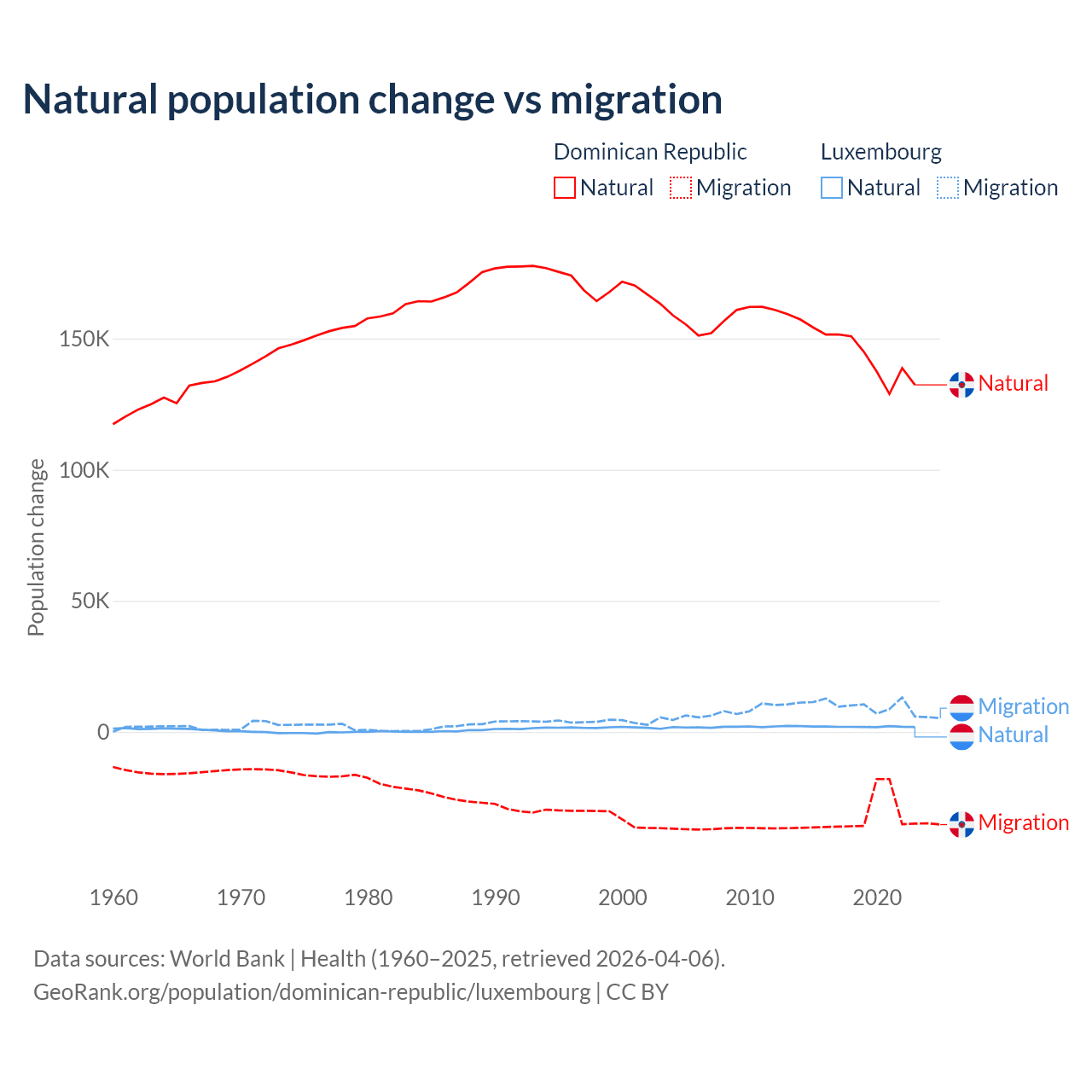 Over the last 10 years, 81.8% of the population change in the Dominican Republic is from natural causes (a gain of 1,447,764 people) and 18.2% is from migration (a loss of 322,919 people). In Luxembourg 16.8% is from natural causes (a gain of 20,287 people) and 83.2% is from migration (a gain of 100,435 people).