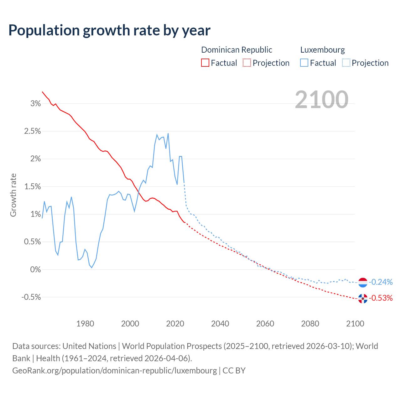 - For the last 10 years, the Dominican Republic has had an average growth rate of +1.04% per year vs +2.02% in Luxembourg.