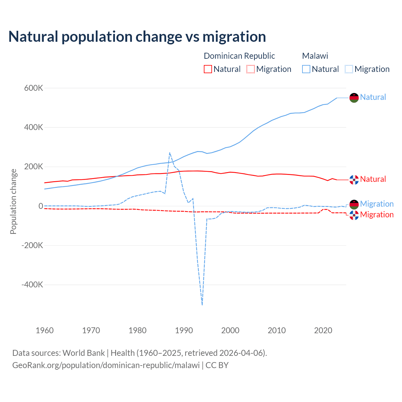 Over the last 10 years, 81.8% of the population change in the Dominican Republic is from natural causes (a gain of 1,447,764 people) and 18.2% is from migration (a loss of 322,919 people). In Malawi 99.3% is from natural causes (a gain of 5,019,393 people) and 0.67% is from migration (a loss of 33,768 people).