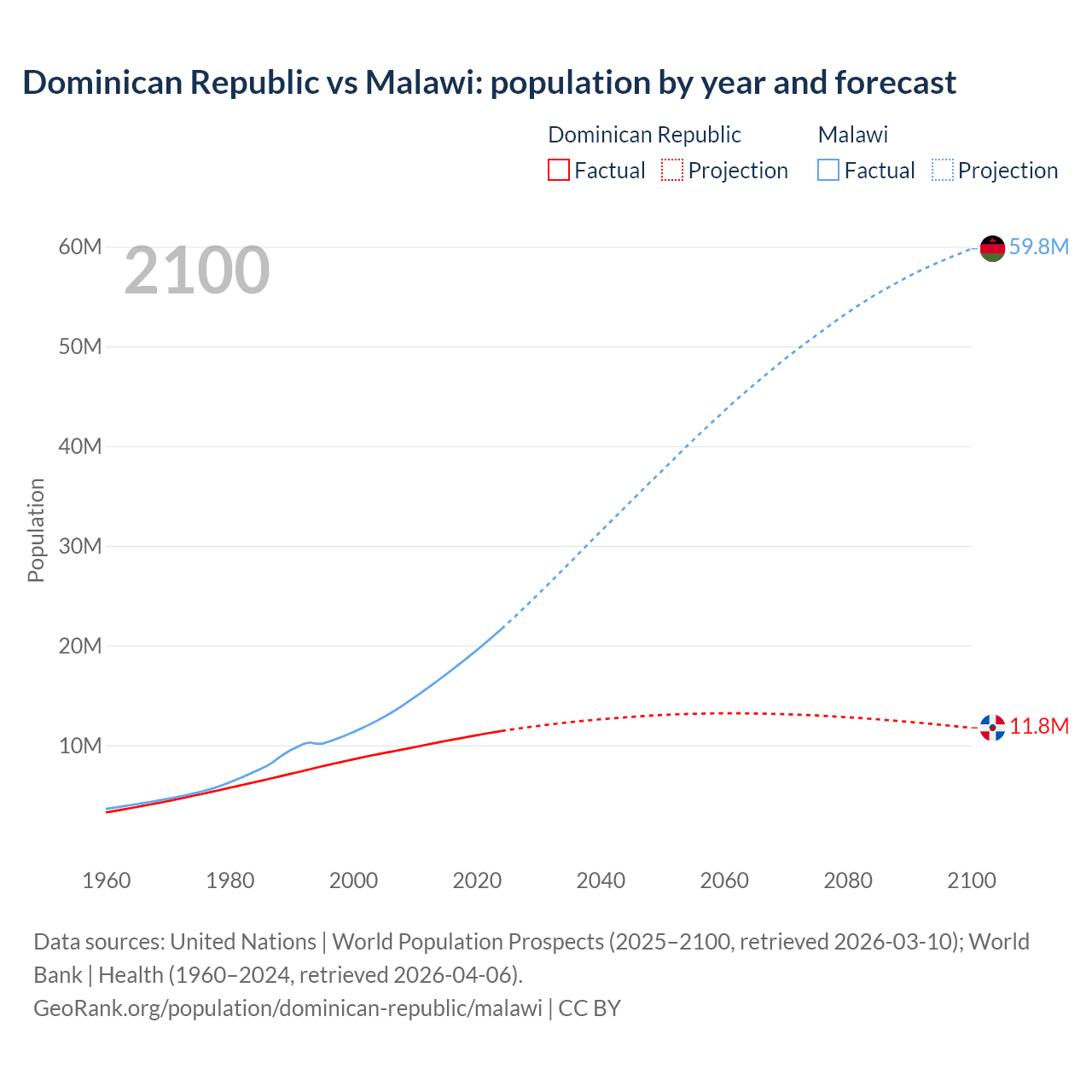 Dominican Republic vs Malawi: population by year and forecast