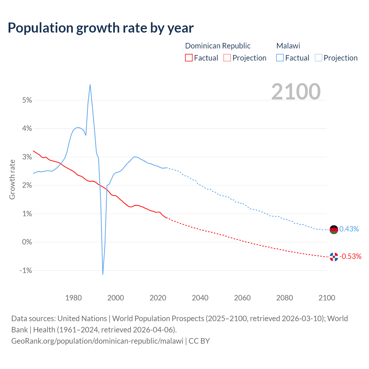 - For the last 10 years, the Dominican Republic has had an average growth rate of +1.04% per year vs +2.7% in Malawi.