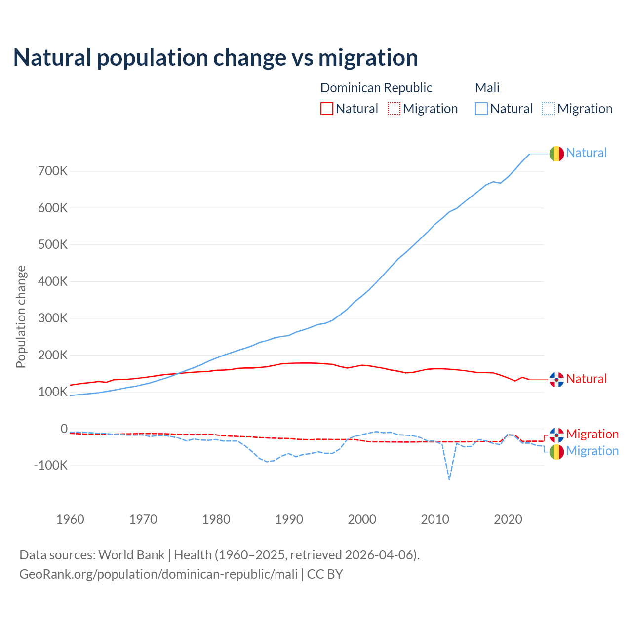 Over the last 10 years, 81.8% of the population change in the Dominican Republic is from natural causes (a gain of 1,447,764 people) and 18.2% is from migration (a loss of 322,919 people). In Mali 94.9% is from natural causes (a gain of 6,749,473 people) and 5.13% is from migration (a loss of 365,292 people).