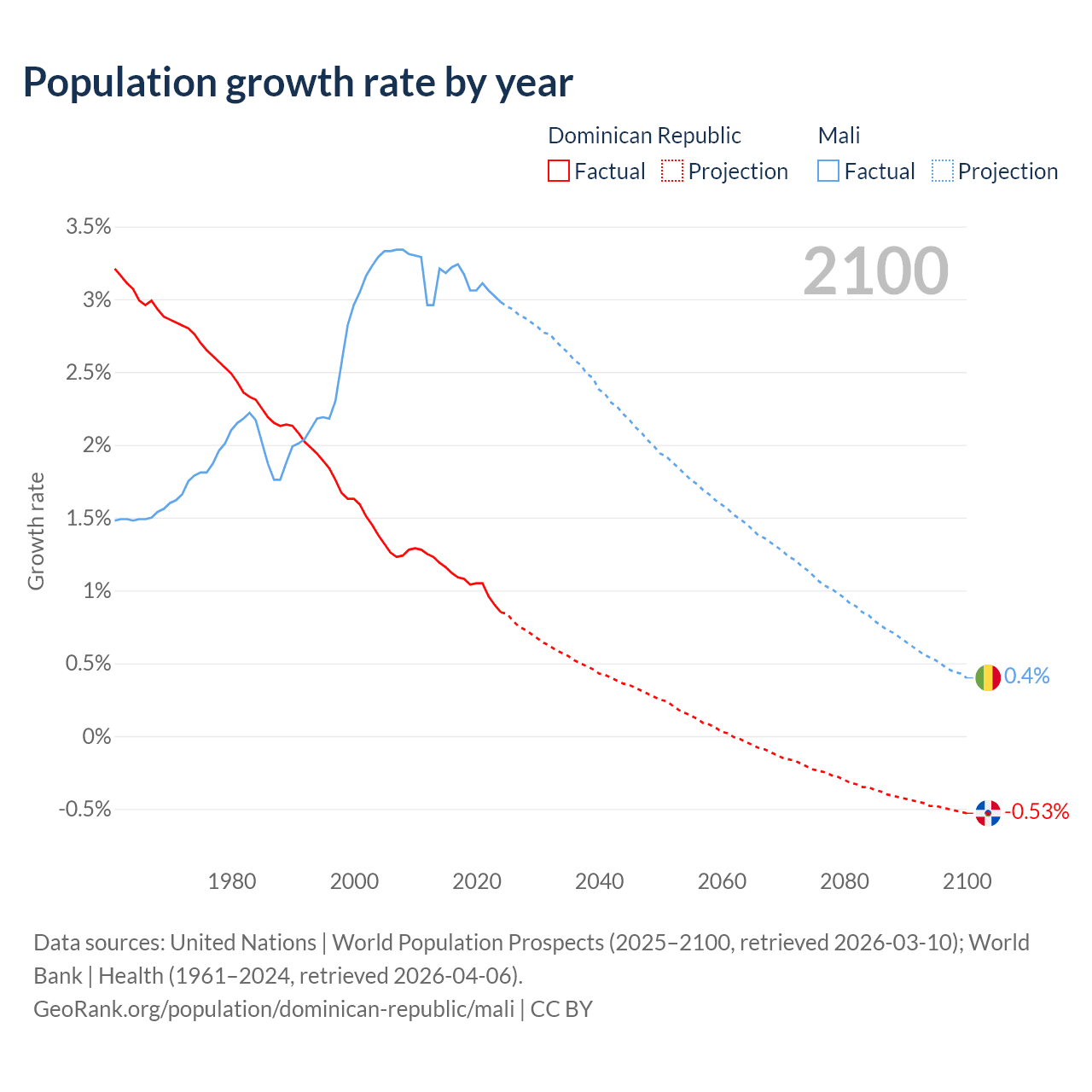 - For the last 10 years, the Dominican Republic has had an average growth rate of +1.04% per year vs +3.12% in Mali.