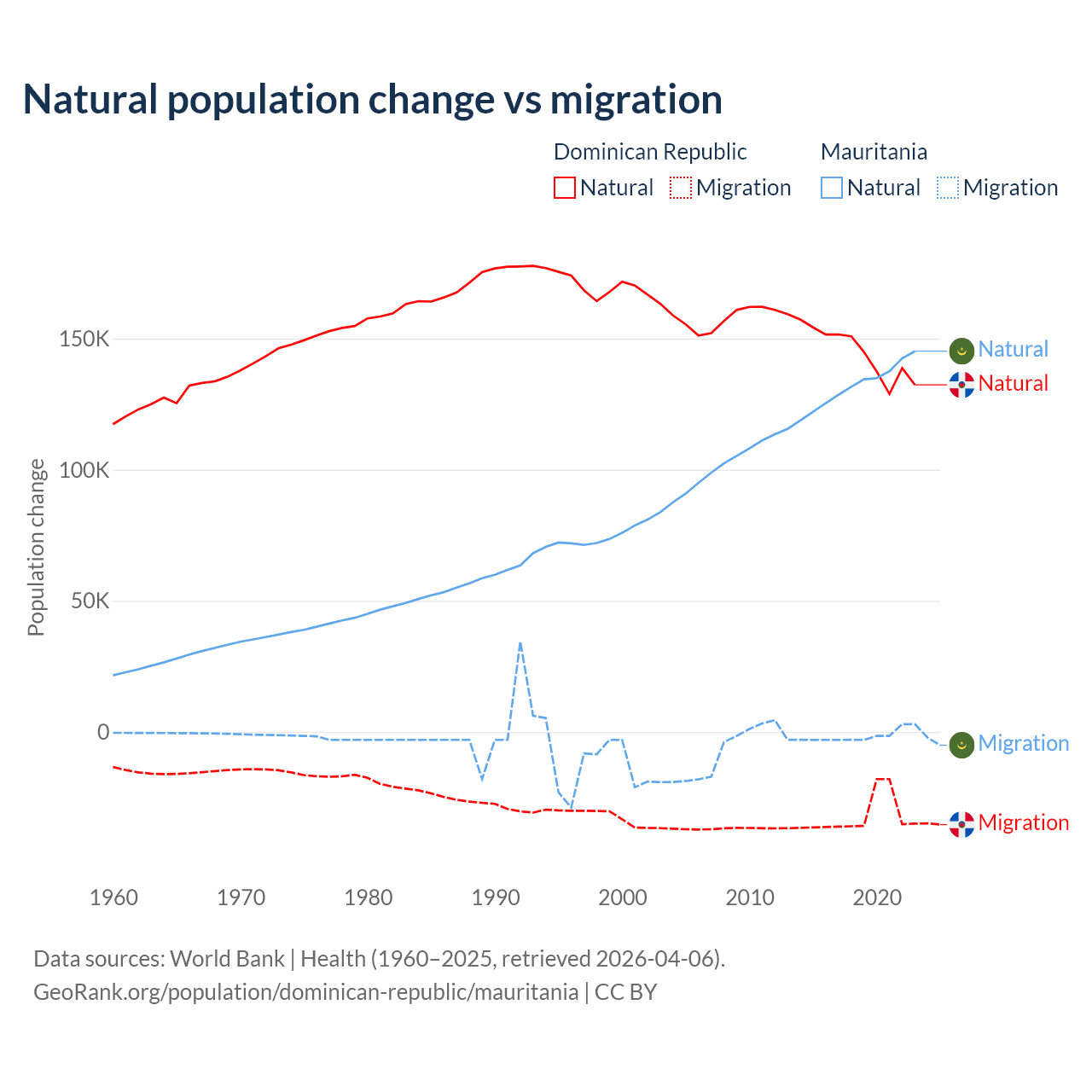 Over the last 10 years, 81.8% of the population change in the Dominican Republic is from natural causes (a gain of 1,447,764 people) and 18.2% is from migration (a loss of 322,919 people). In Mauritania 98.9% is from natural causes (a gain of 1,320,903 people) and 1.12% is from migration (a loss of 14,982 people).