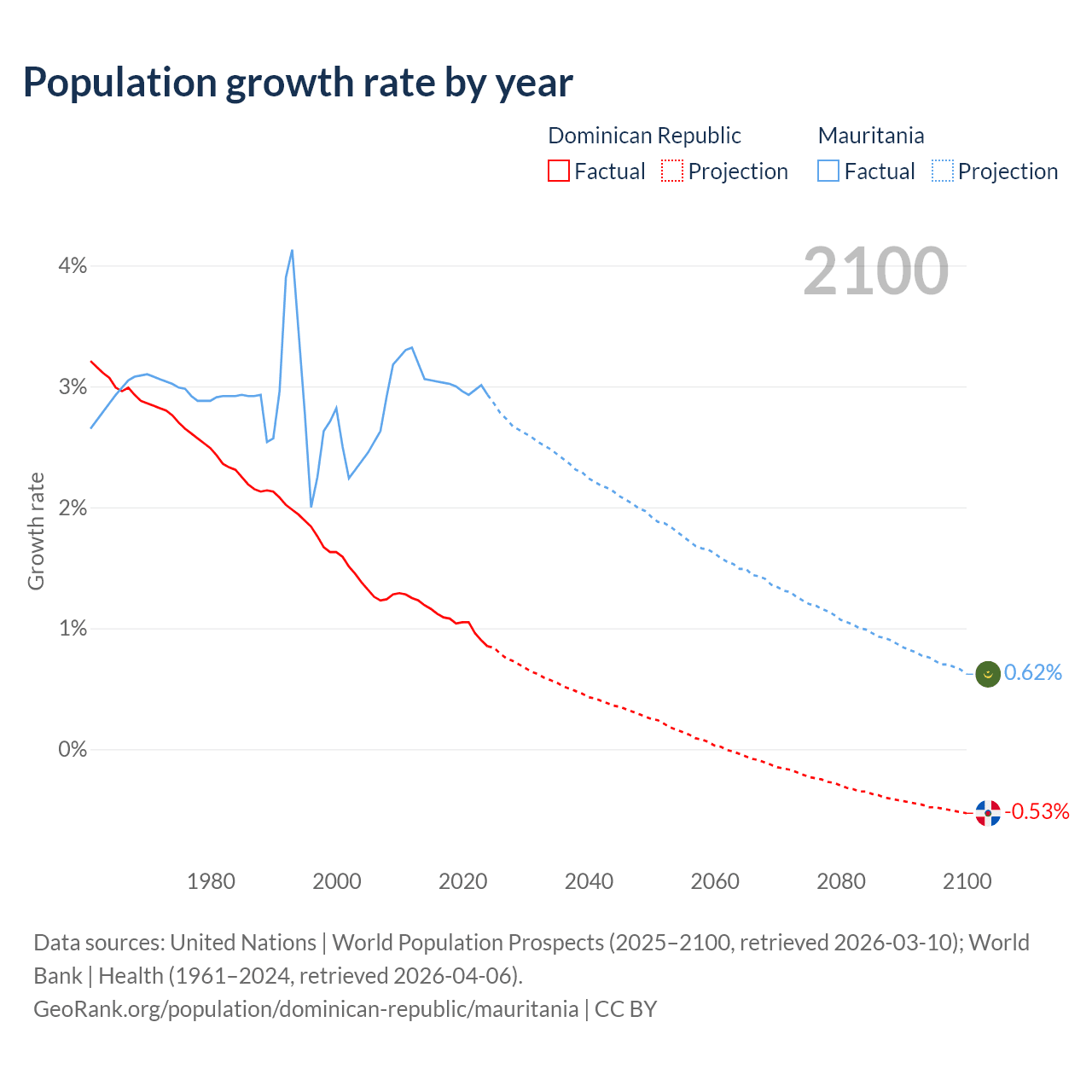 - For the last 10 years, the Dominican Republic has had an average growth rate of +1.04% per year vs +3% in Mauritania.