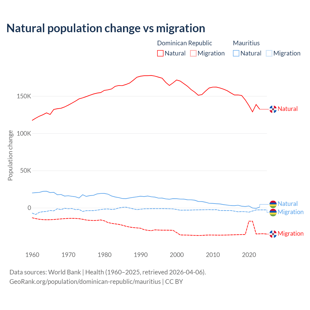Over the last 10 years, 81.8% of the population change in the Dominican Republic is from natural causes (a gain of 1,447,764 people) and 18.2% is from migration (a loss of 322,919 people). In Mauritius 30.9% is from natural causes (a gain of 19,327 people) and 69.1% is from migration (a loss of 43,294 people).