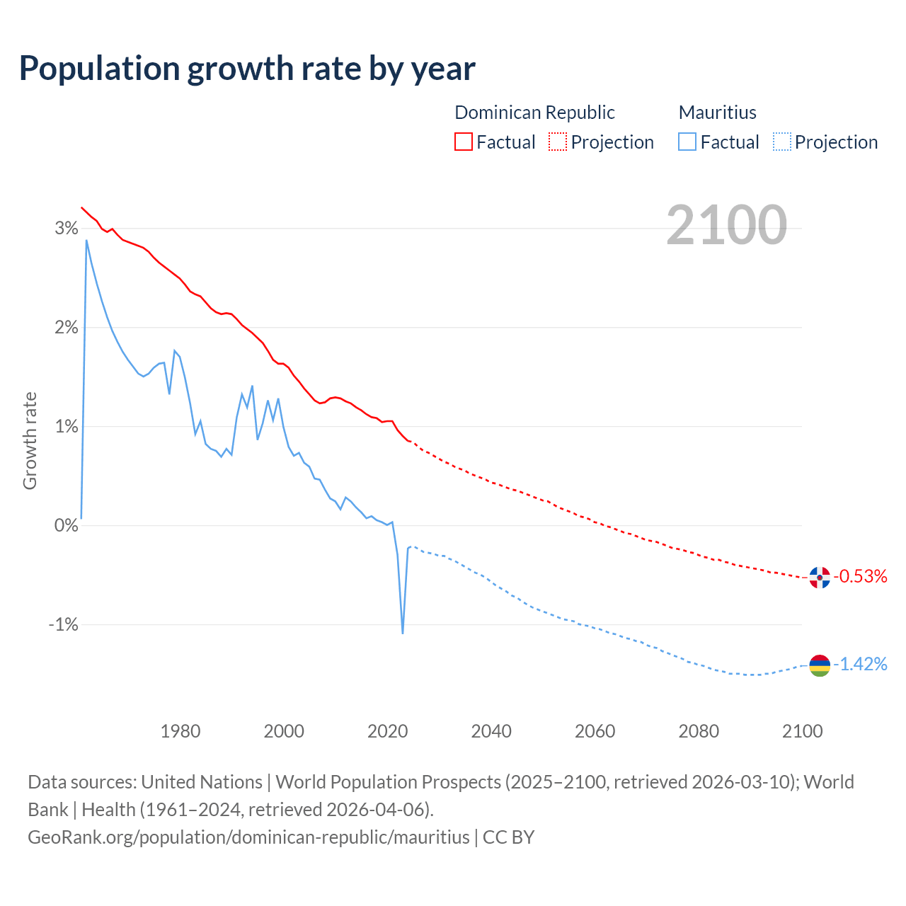 - For the last 10 years, the Dominican Republic has had an average growth rate of +1.04% per year vs -0.09% in Mauritius.