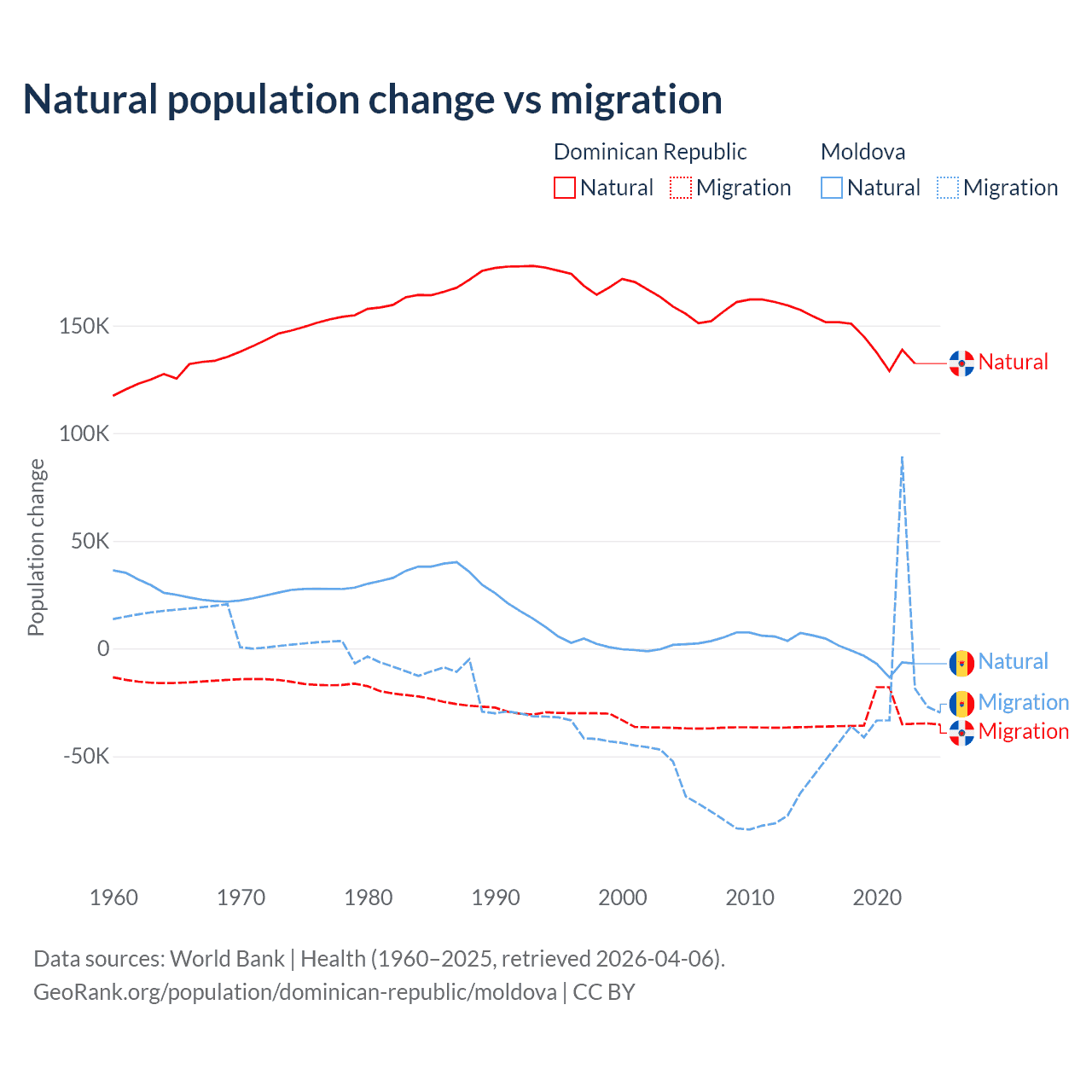 Over the last 10 years, 81.8% of the population change in the Dominican Republic is from natural causes (a gain of 1,447,764 people) and 18.2% is from migration (a loss of 322,919 people). In Moldova 6.04% is from natural causes (a loss of 19,001 people) and 94% is from migration (a loss of 295,631 people).