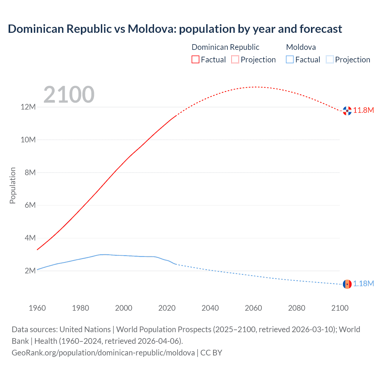 The latest officially reported population of the Dominican Republic was 11,427,557 in 2024 vs 2,402,306 people in Moldova in 2024. In 2026, based on the adjusted UN estimation, the current Dominican Republic's population is 11,637,906 people compared to 2,341,166 in Moldova.