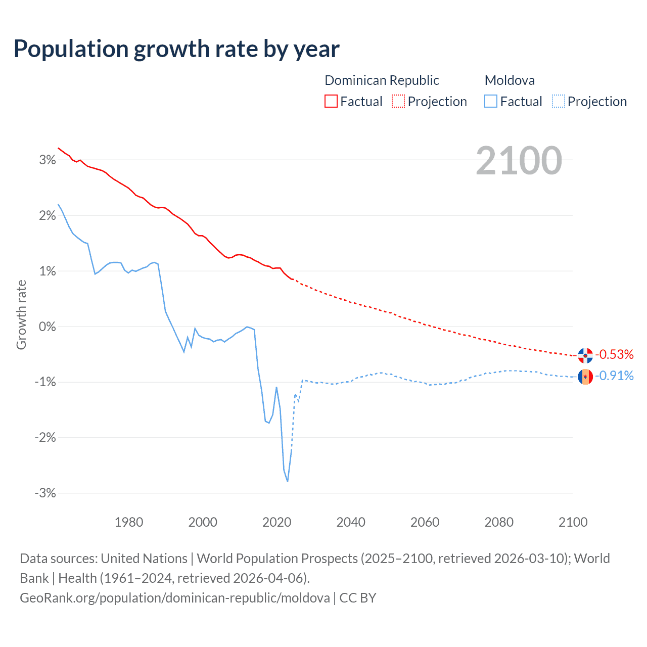 - For the last 10 years, the Dominican Republic has had an average growth rate of +1.04% per year vs -1.57% in Moldova.