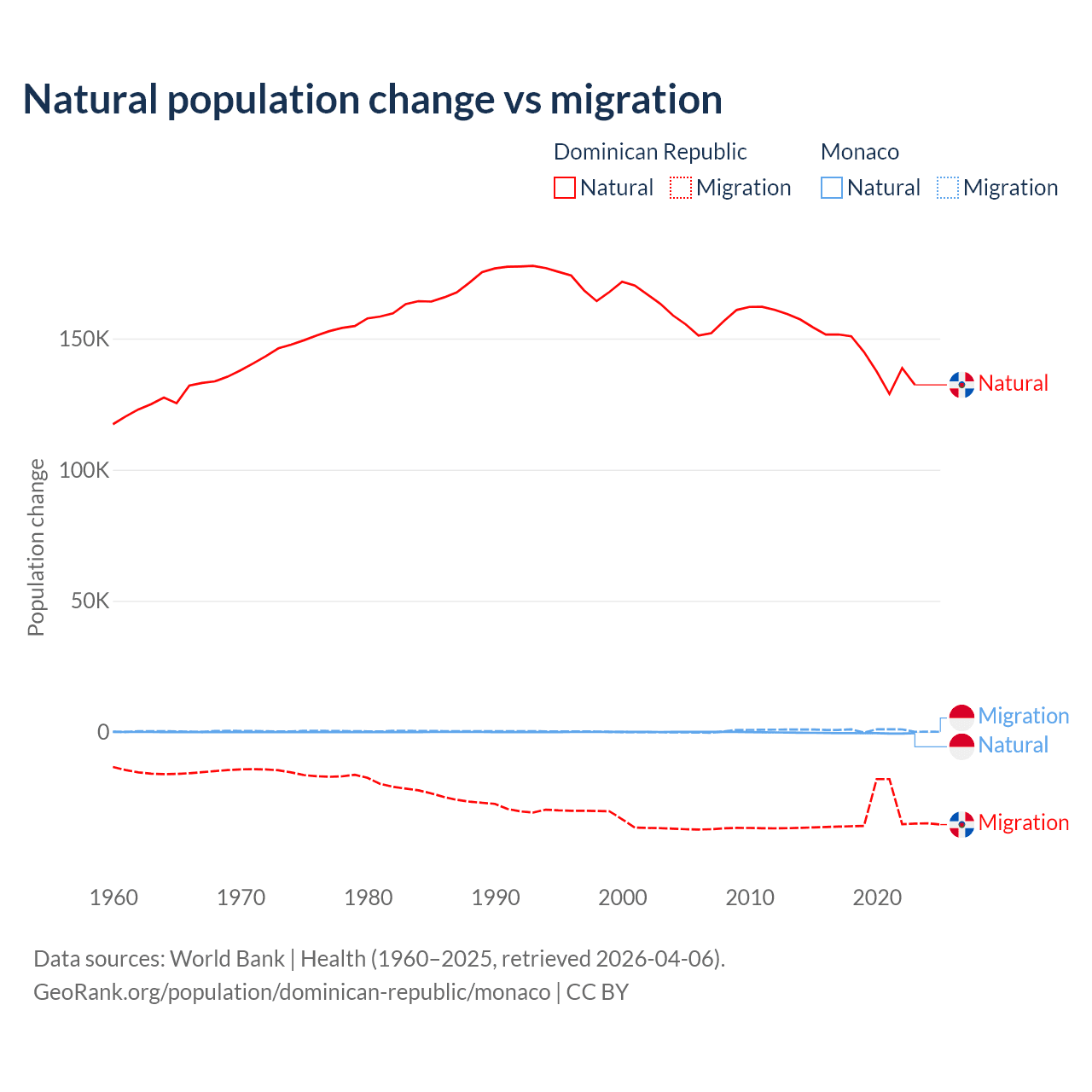 Over the last 10 years, 81.8% of the population change in the Dominican Republic is from natural causes (a gain of 1,447,764 people) and 18.2% is from migration (a loss of 322,919 people). In Monaco 37.3% is from natural causes (a loss of 4,357 people) and 62.7% is from migration (a gain of 7,333 people).
