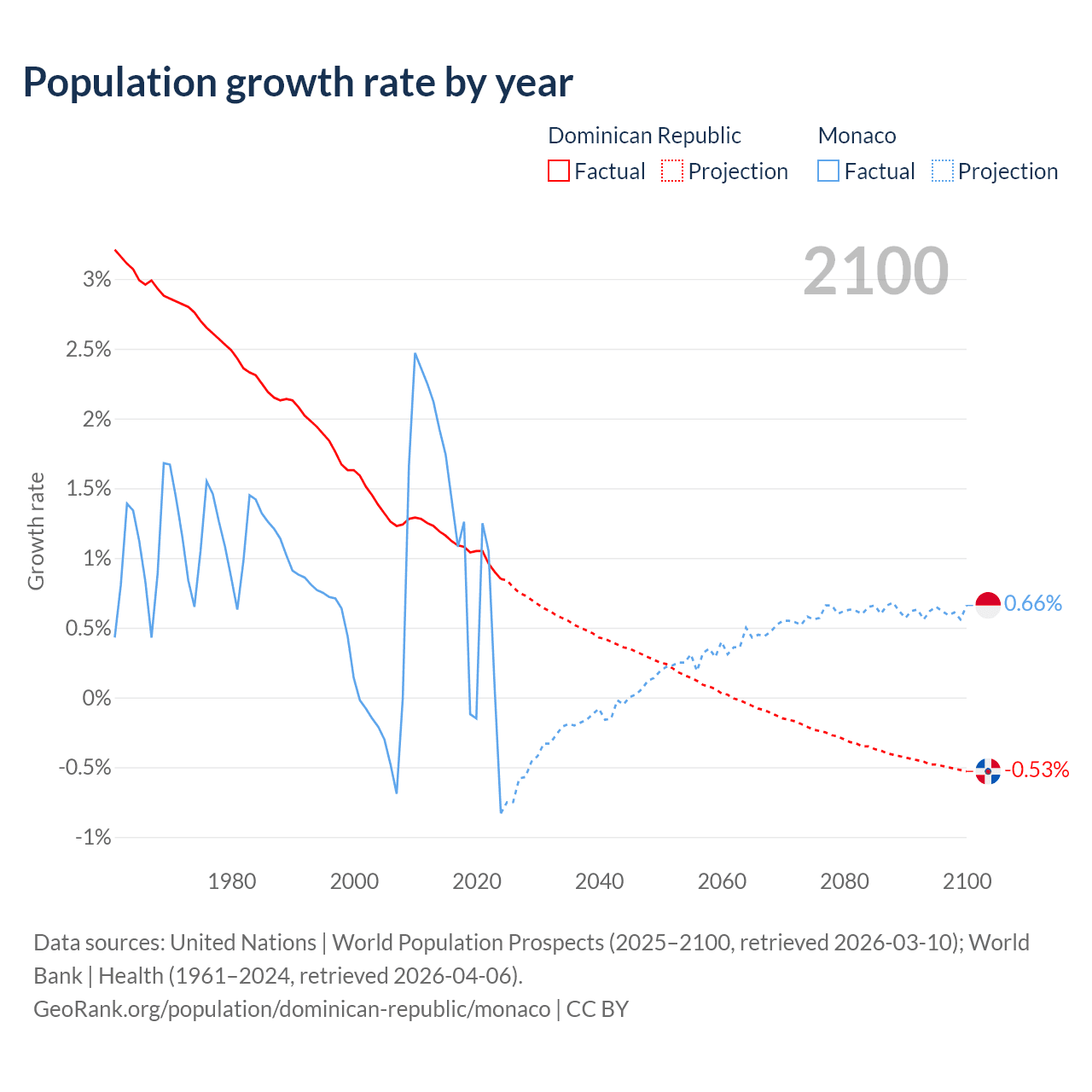 - For the last 10 years, the Dominican Republic has had an average growth rate of +1.04% per year vs +0.79% in Monaco.