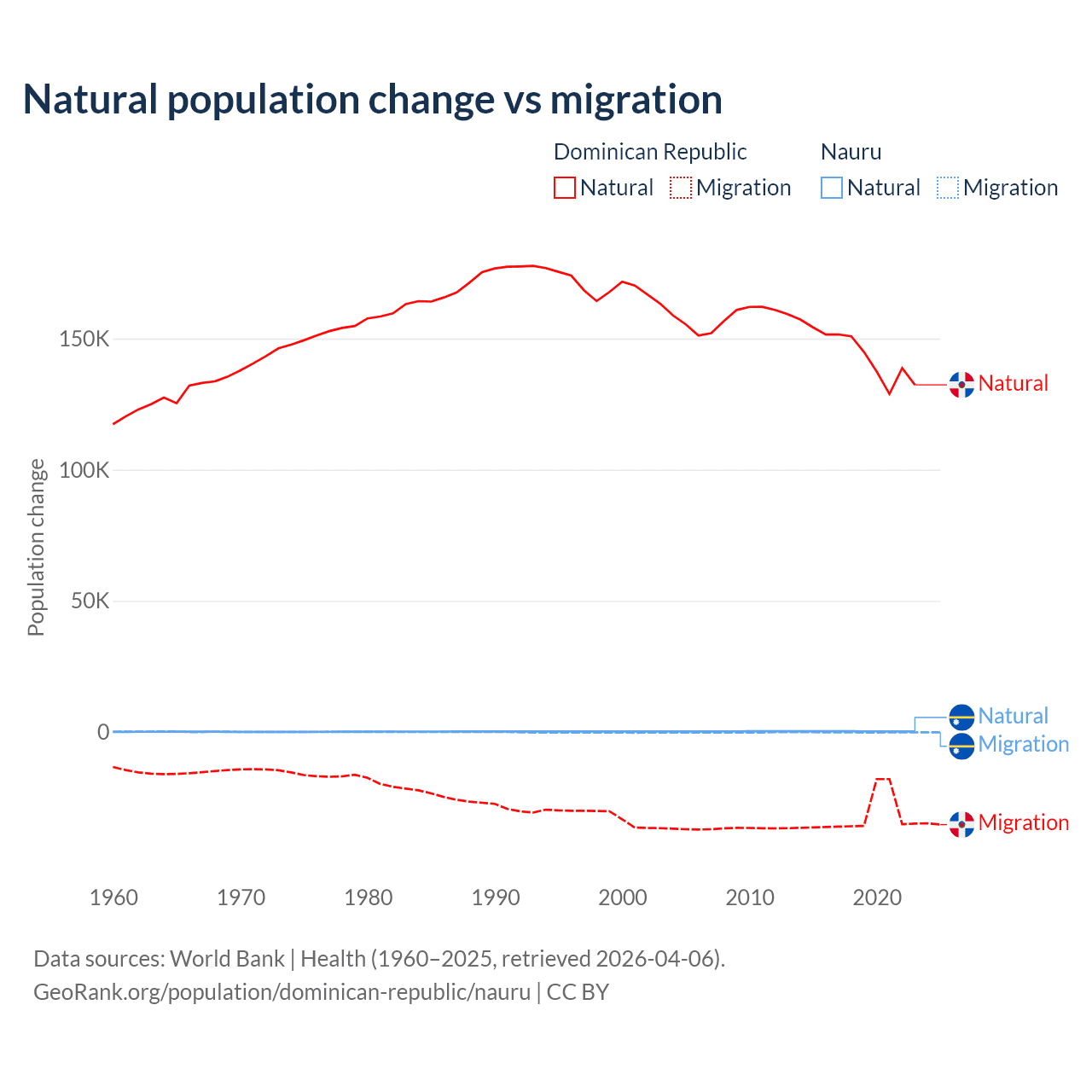Over the last 10 years, 81.8% of the population change in the Dominican Republic is from natural causes (a gain of 1,447,764 people) and 18.2% is from migration (a loss of 322,919 people). In Nauru 66.2% is from natural causes (a gain of 2,590 people) and 33.8% is from migration (a loss of 1,320 people).