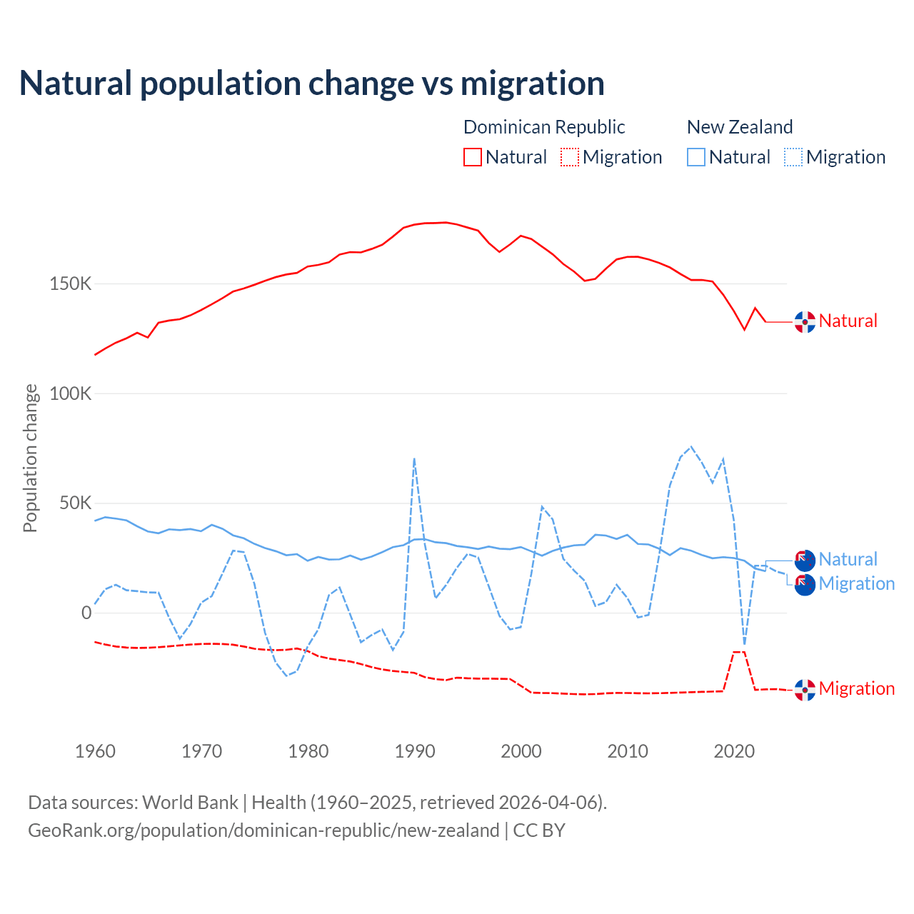 Over the last 10 years, 81.8% of the population change in the Dominican Republic is from natural causes (a gain of 1,447,764 people) and 18.2% is from migration (a loss of 322,919 people). In New Zealand 34.4% is from natural causes (a gain of 247,767 people) and 65.6% is from migration (a gain of 471,602 people).