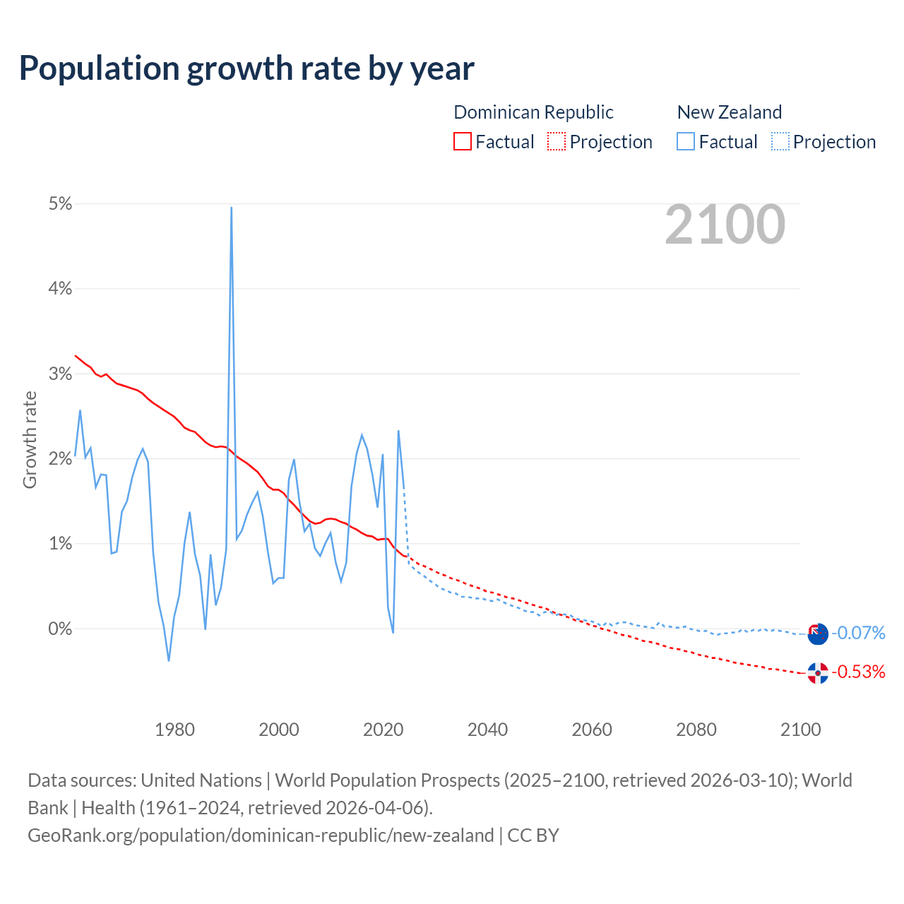 - For the last 10 years, the Dominican Republic has had an average growth rate of +1.04% per year vs +1.6% in New Zealand.