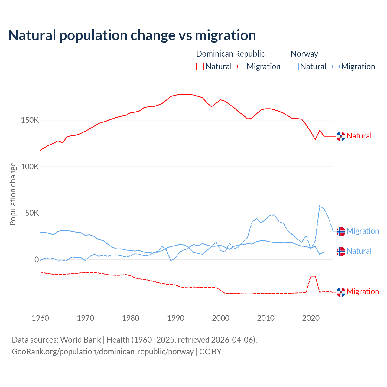 Over the last 10 years, 81.8% of the population change in the Dominican Republic is from natural causes (a gain of 1,447,764 people) and 18.2% is from migration (a loss of 322,919 people). In Norway 31.3% is from natural causes (a gain of 138,699 people) and 68.7% is from migration (a gain of 303,945 people).