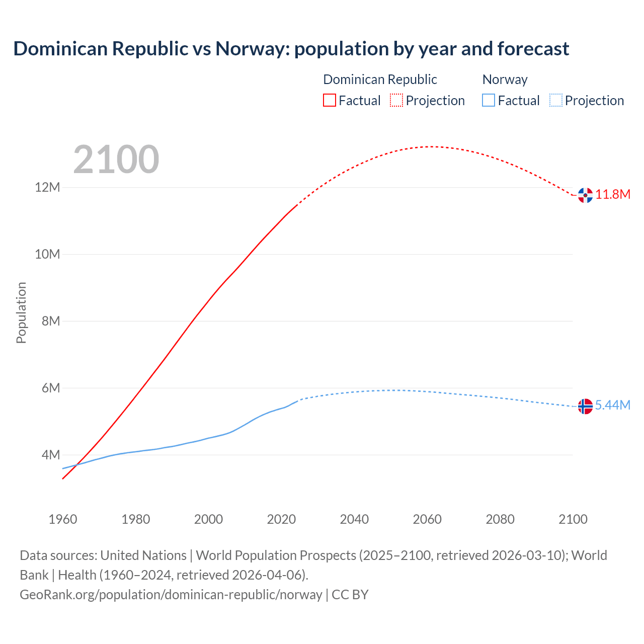 The latest officially reported population of the Dominican Republic was 11,427,557 in 2024 vs 5,572,279 people in Norway in 2024. In 2026, based on the adjusted UN estimation, the current Dominican Republic's population is 11,637,906 people compared to 5,671,119 in Norway.