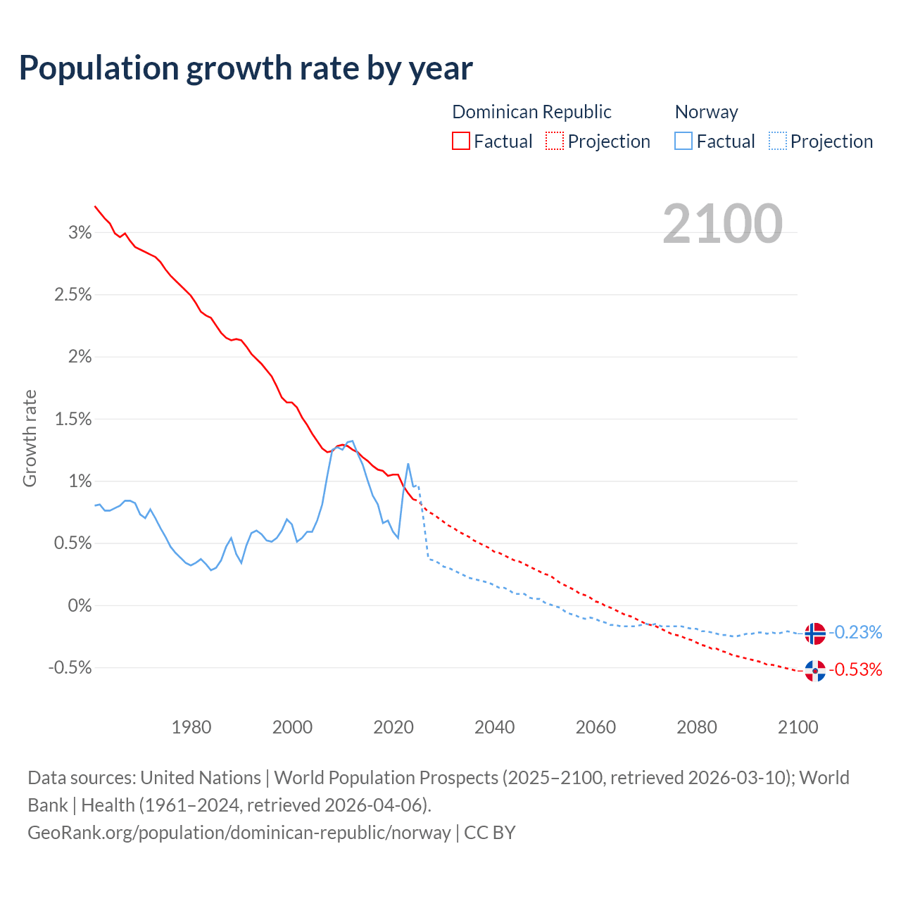 - For the last 10 years, the Dominican Republic has had an average growth rate of +1.04% per year vs +0.85% in Norway.