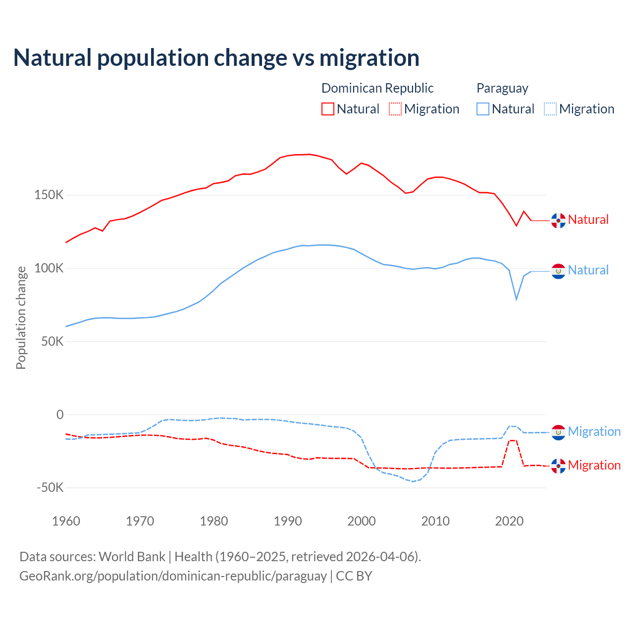 Over the last 10 years, 81.8% of the population change in the Dominican Republic is from natural causes (a gain of 1,447,764 people) and 18.2% is from migration (a loss of 322,919 people). In Paraguay 87.6% is from natural causes (a gain of 1,002,636 people) and 12.4% is from migration (a loss of 141,377 people).