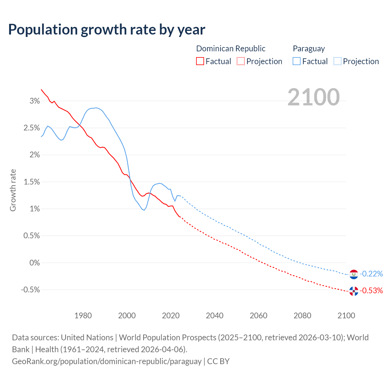 - For the last 10 years, the Dominican Republic has had an average growth rate of +1.04% per year vs +1.34% in Paraguay.