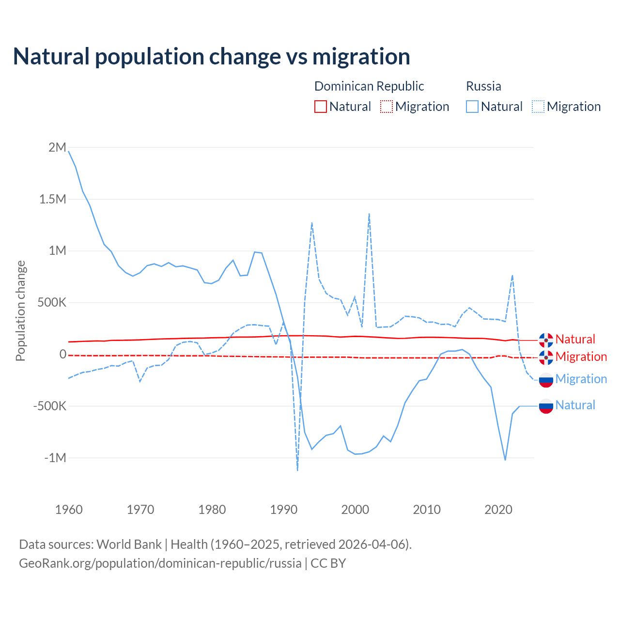 Over the last 10 years, 81.8% of the population change in the Dominican Republic is from natural causes (a gain of 1,447,764 people) and 18.2% is from migration (a loss of 322,919 people). In Russia 48.6% is from natural causes (a loss of 3,416,377 people) and 51.4% is from migration (a gain of 3,611,826 people).