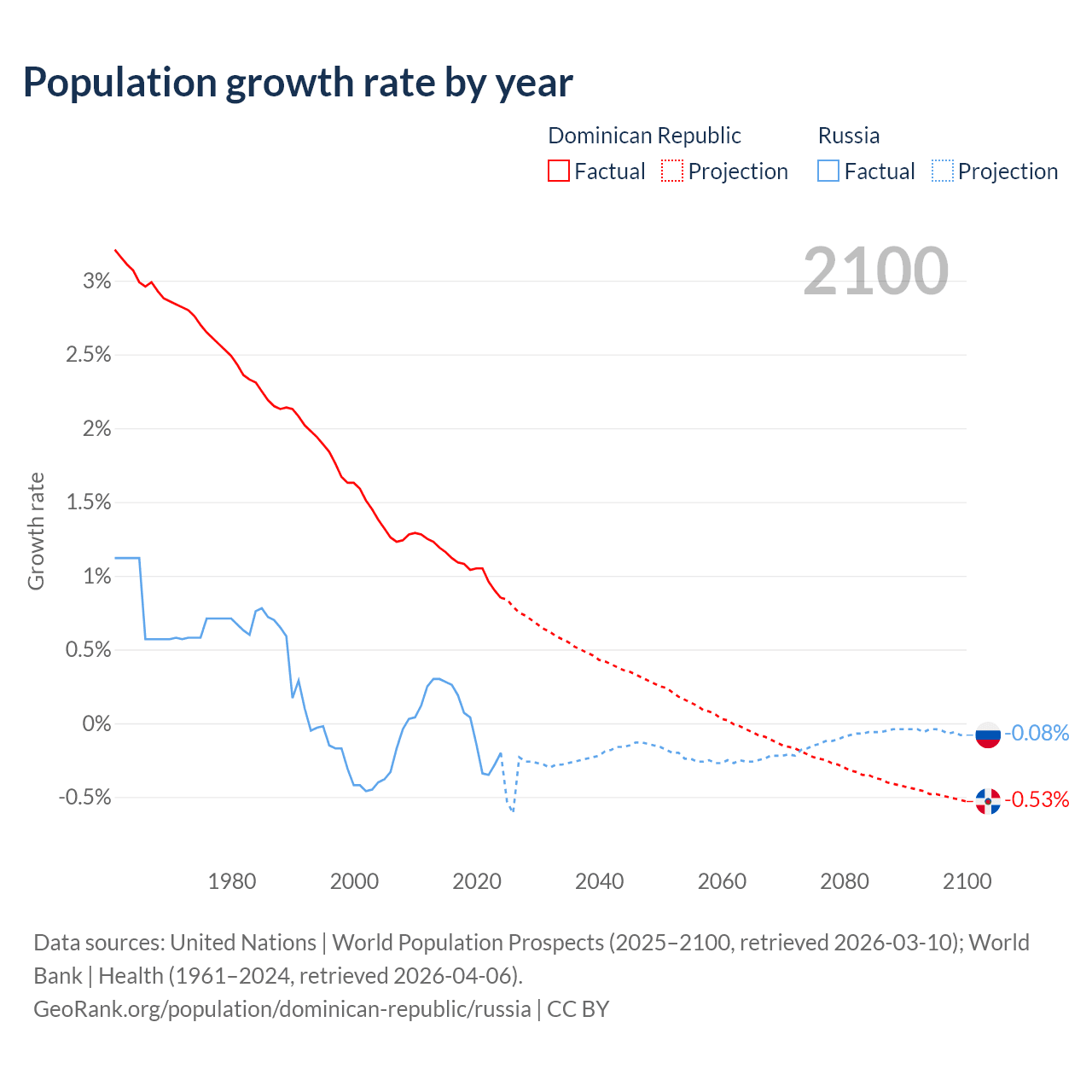 - For the last 10 years, the Dominican Republic has had an average growth rate of +1.04% per year vs -0.02% in Russia.