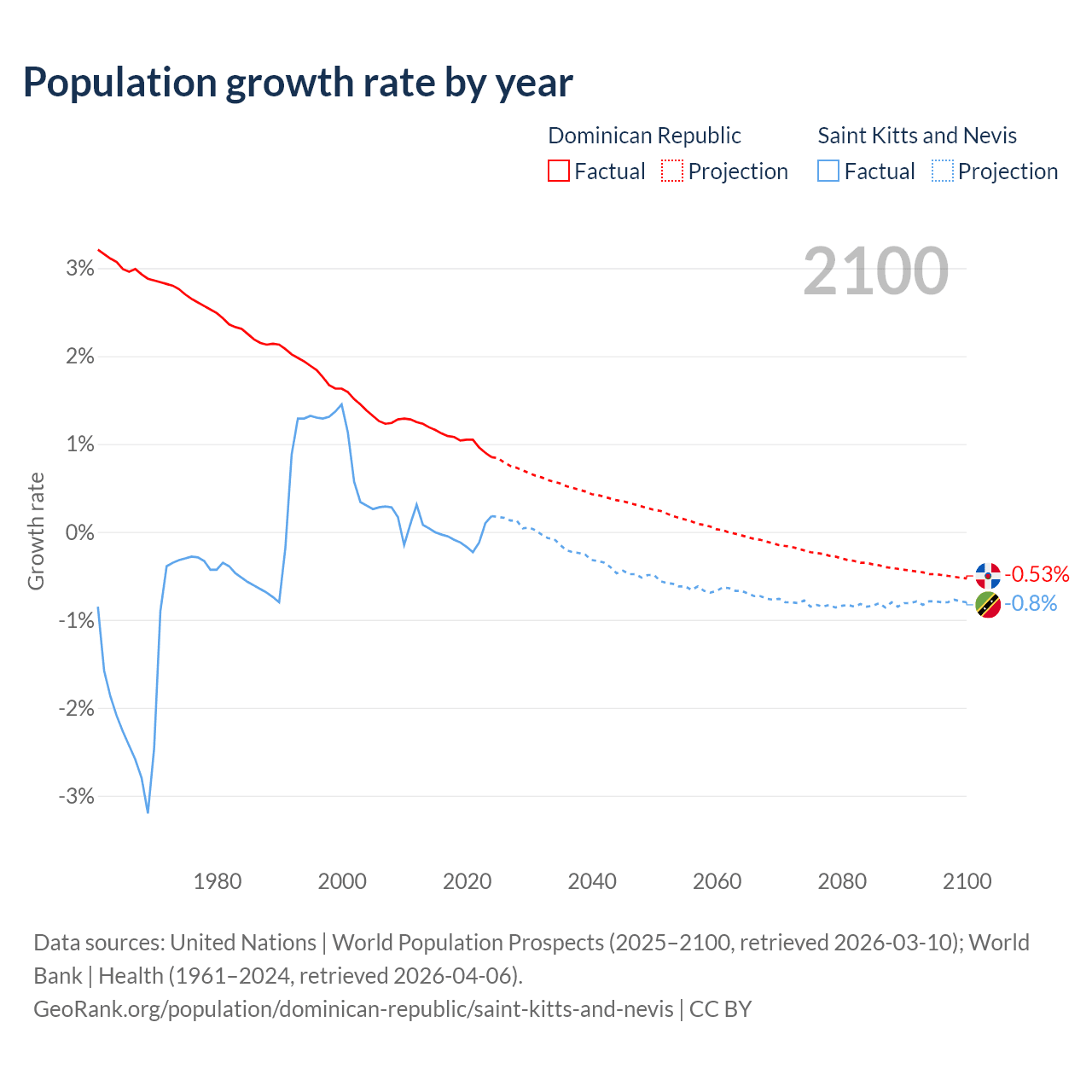 Dominican Republic vs Saint Kitts and Nevis: population by year and forecast