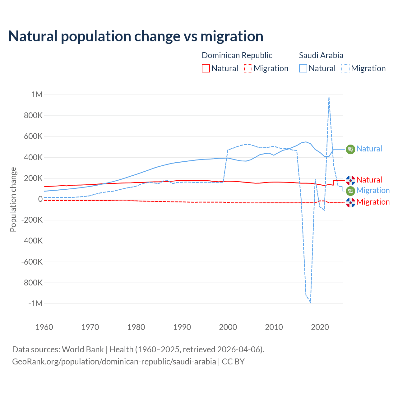 Over the last 10 years, 81.8% of the population change in the Dominican Republic is from natural causes (a gain of 1,447,764 people) and 18.2% is from migration (a loss of 322,919 people). In Saudi Arabia 93.9% is from natural causes (a gain of 4,829,562 people) and 6.05% is from migration (a gain of 311,209 people).