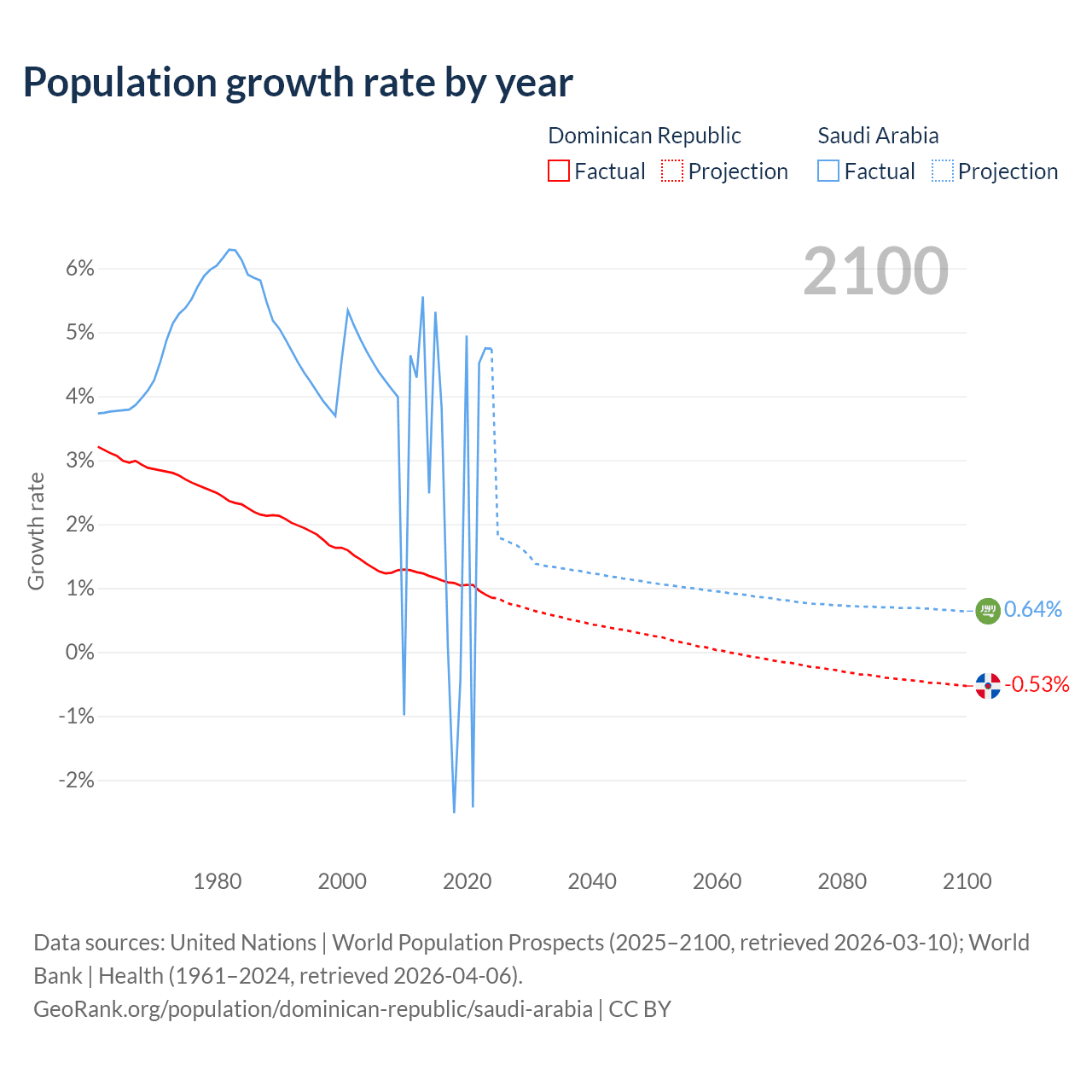- For the last 10 years, the Dominican Republic has had an average growth rate of +1.04% per year vs +2.3% in Saudi Arabia.