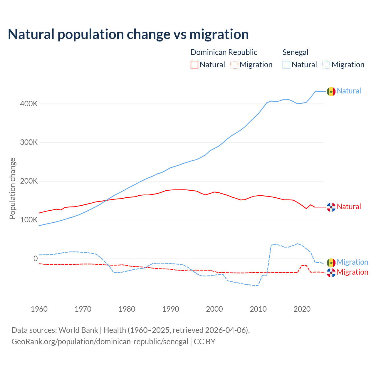 Over the last 10 years, 81.8% of the population change in the Dominican Republic is from natural causes (a gain of 1,447,764 people) and 18.2% is from migration (a loss of 322,919 people). In Senegal 93.9% is from natural causes (a gain of 4,089,205 people) and 6.13% is from migration (a gain of 267,266 people).