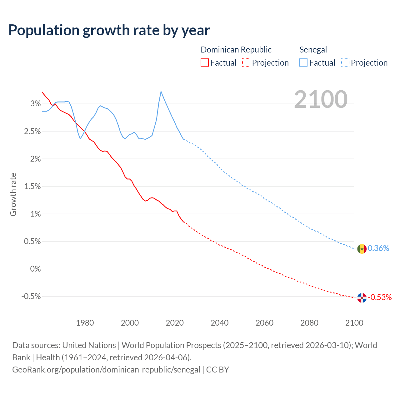 - For the last 10 years, the Dominican Republic has had an average growth rate of +1.04% per year vs +2.76% in Senegal.