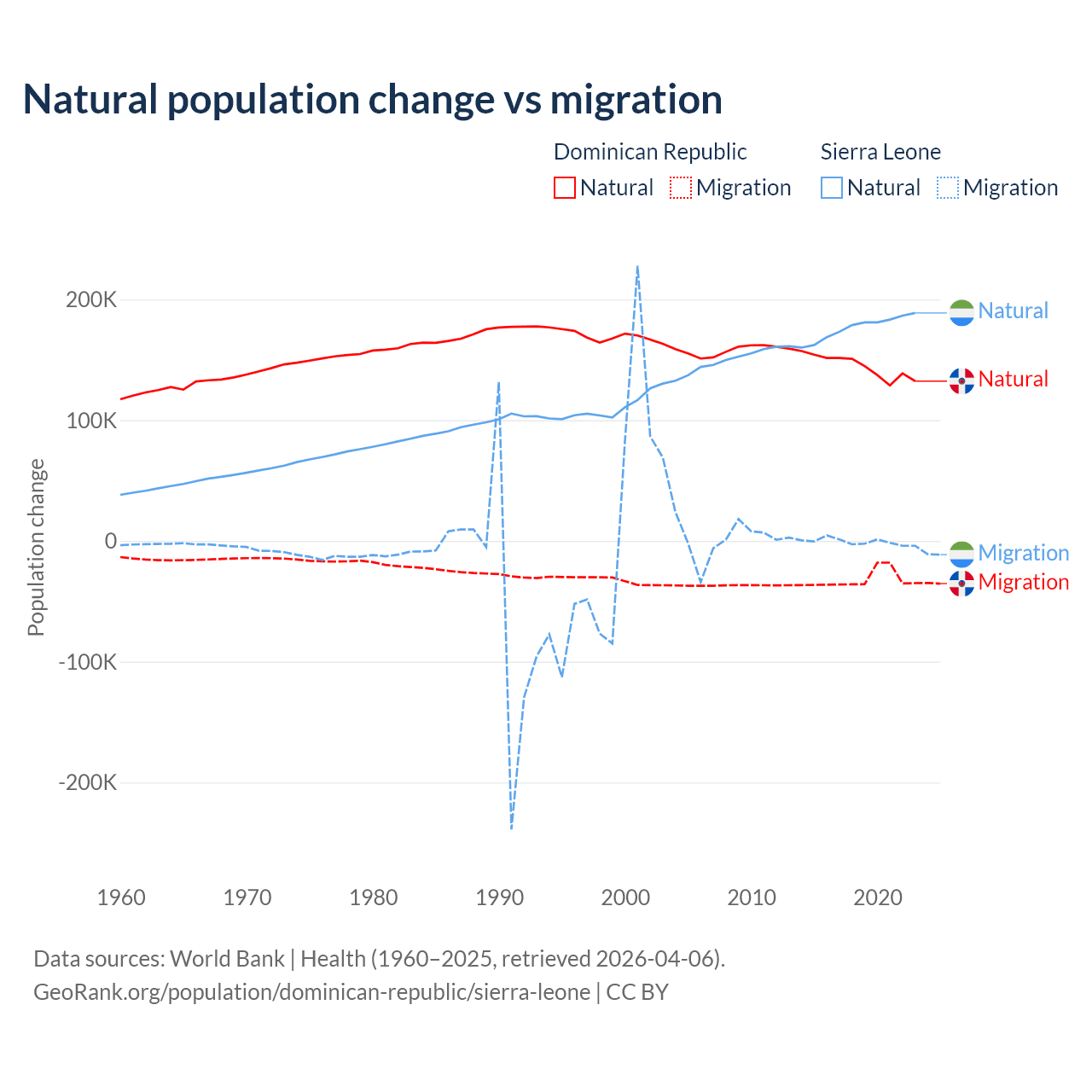 Over the last 10 years, 81.8% of the population change in the Dominican Republic is from natural causes (a gain of 1,447,764 people) and 18.2% is from migration (a loss of 322,919 people). In Sierra Leone 99.6% is from natural causes (a gain of 1,764,049 people) and 0.41% is from migration (a loss of 7,211 people).