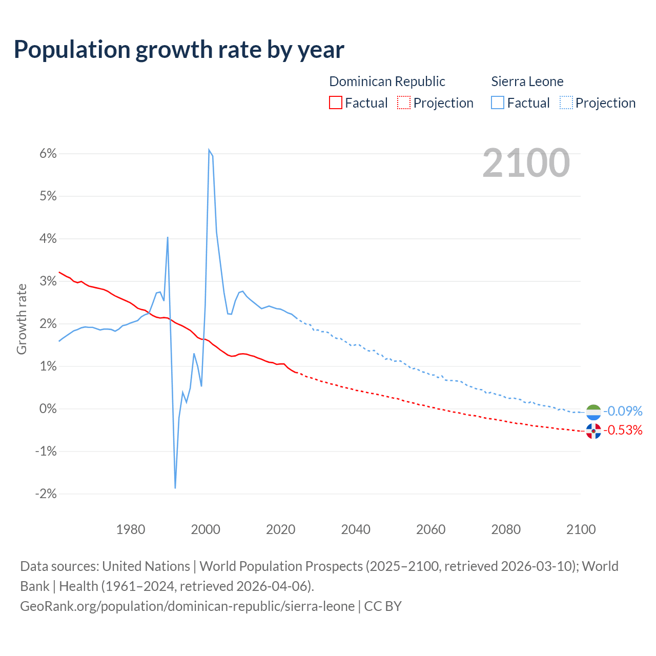 - For the last 10 years, the Dominican Republic has had an average growth rate of +1.04% per year vs +2.32% in Sierra Leone.