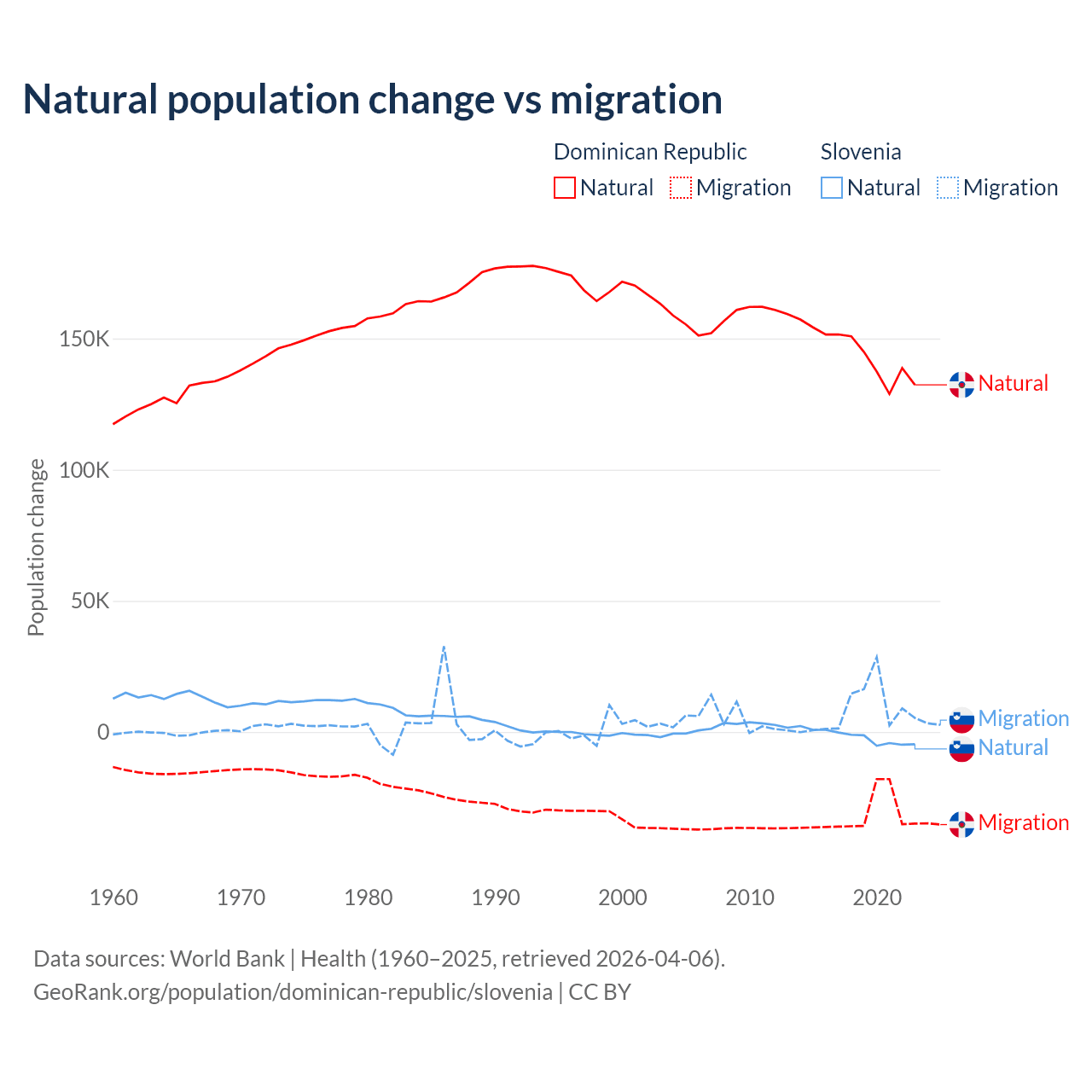 Over the last 10 years, 81.8% of the population change in the Dominican Republic is from natural causes (a gain of 1,447,764 people) and 18.2% is from migration (a loss of 322,919 people). In Slovenia 18.1% is from natural causes (a loss of 17,573 people) and 81.9% is from migration (a gain of 79,532 people).