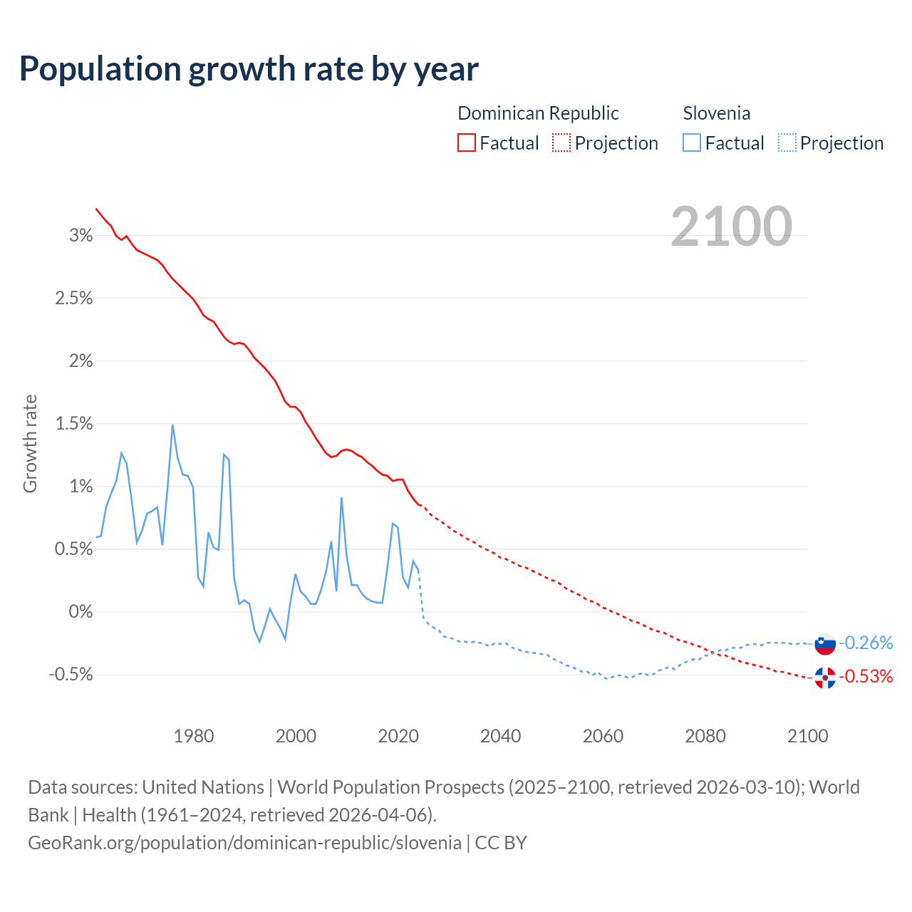 - For the last 10 years, the Dominican Republic has had an average growth rate of +1.04% per year vs +0.29% in Slovenia.