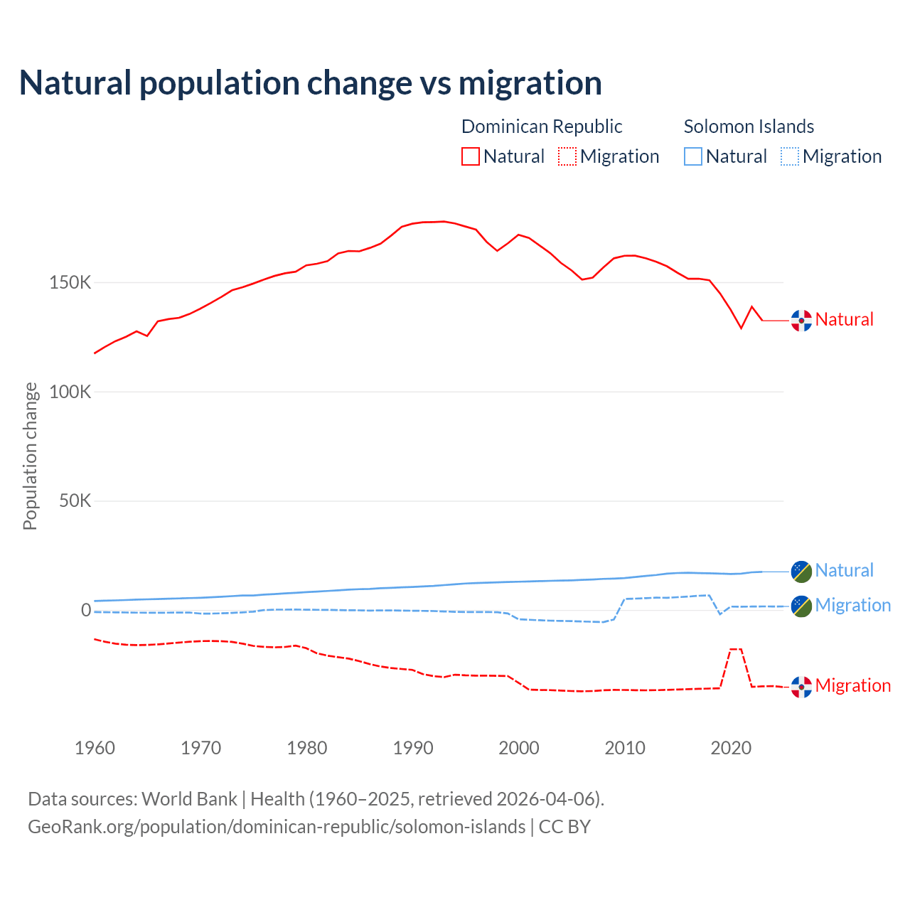 Over the last 10 years, 81.8% of the population change in the Dominican Republic is from natural causes (a gain of 1,447,764 people) and 18.2% is from migration (a loss of 322,919 people). In the Solomon Islands 82.8% is from natural causes (a gain of 168,727 people) and 17.2% is from migration (a gain of 35,031 people).
