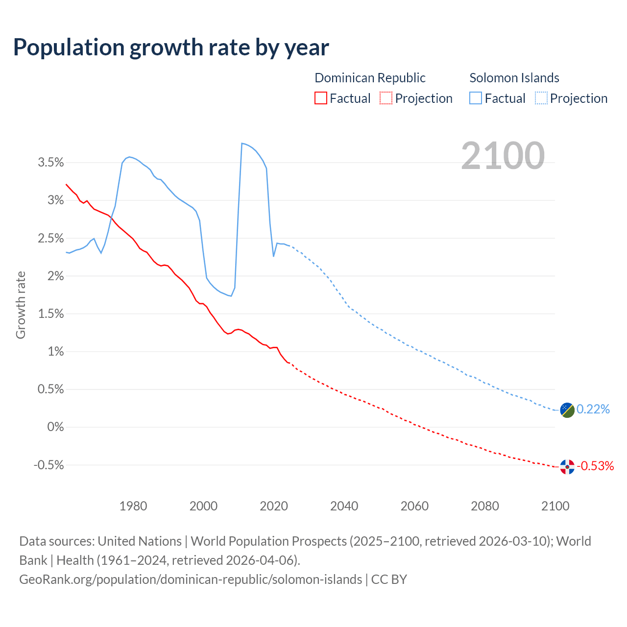 - For the last 10 years, the Dominican Republic has had an average growth rate of +1.04% per year vs +2.95% in the Solomon Islands.