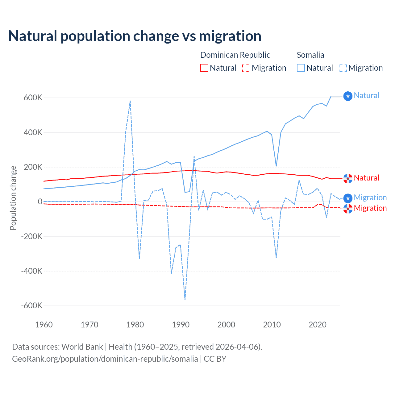 Over the last 10 years, 81.8% of the population change in the Dominican Republic is from natural causes (a gain of 1,447,764 people) and 18.2% is from migration (a loss of 322,919 people). In Somalia 94.4% is from natural causes (a gain of 5,270,105 people) and 5.58% is from migration (a gain of 311,487 people).