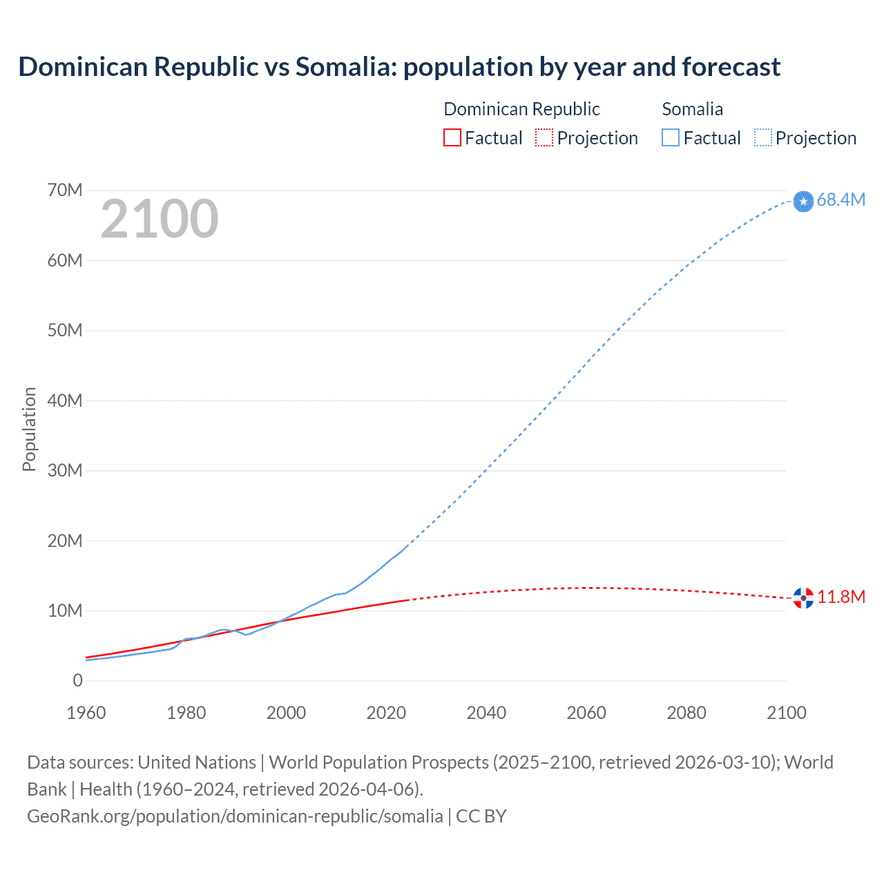Dominican Republic vs Somalia: population by year and forecast