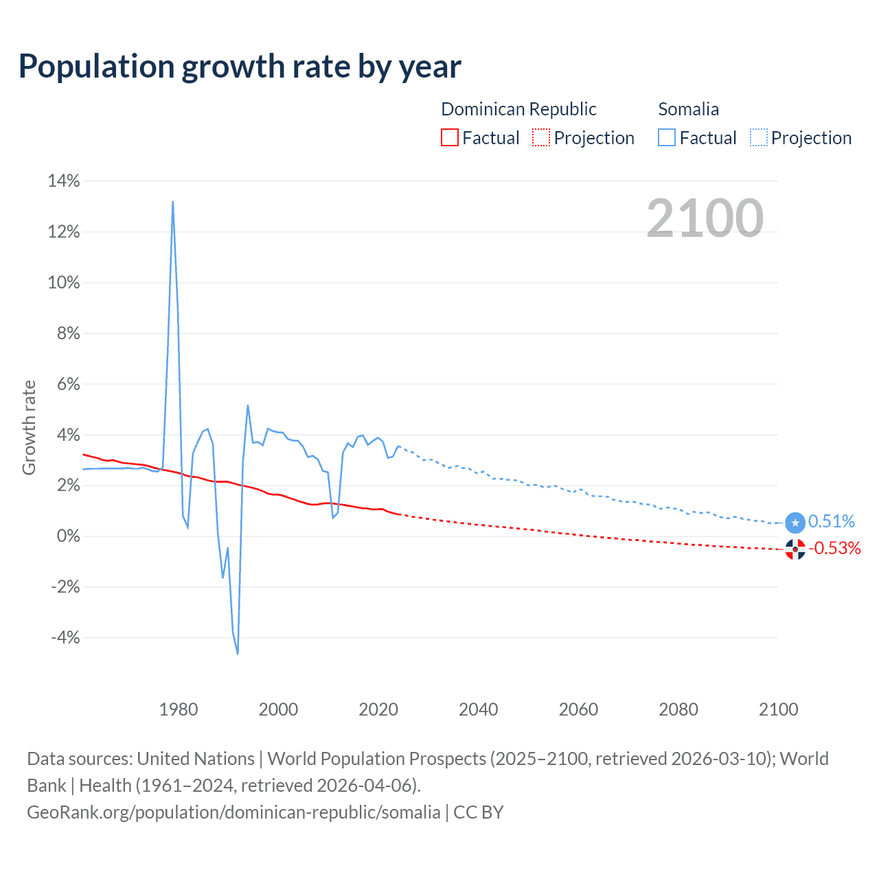 - For the last 10 years, the Dominican Republic has had an average growth rate of +1.04% per year vs +3.61% in Somalia.