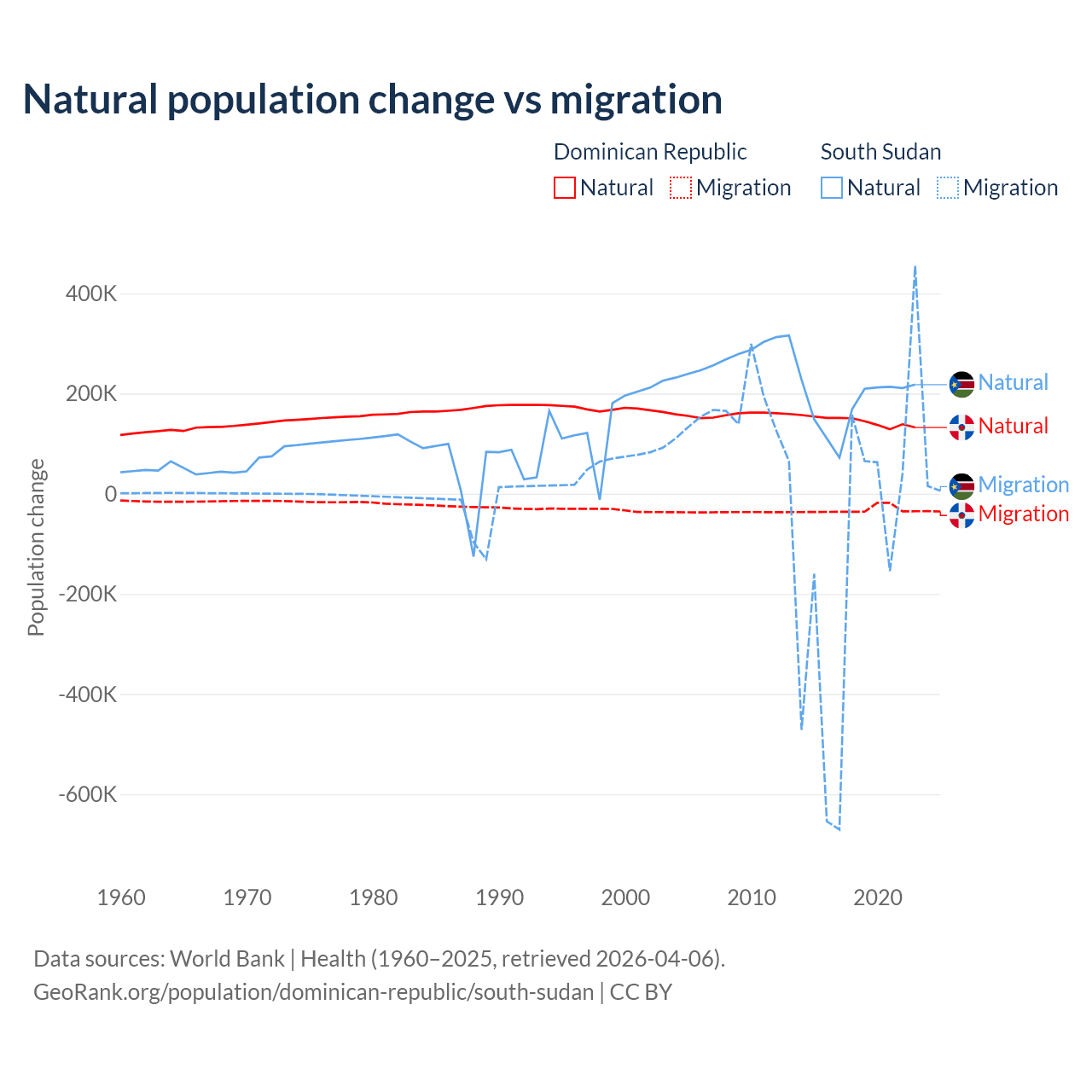 Over the last 10 years, 81.8% of the population change in the Dominican Republic is from natural causes (a gain of 1,447,764 people) and 18.2% is from migration (a loss of 322,919 people). In South Sudan 57.4% is from natural causes (a gain of 1,792,135 people) and 42.6% is from migration (a loss of 1,329,606 people).