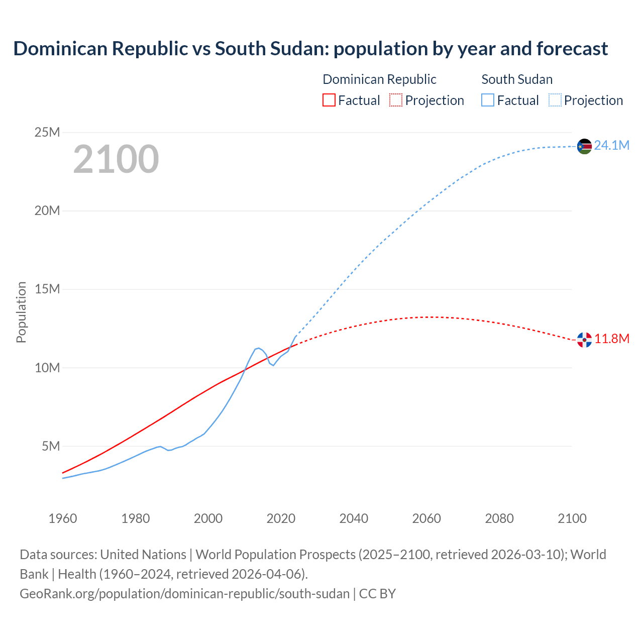 Dominican Republic vs South Sudan: population by year and forecast
