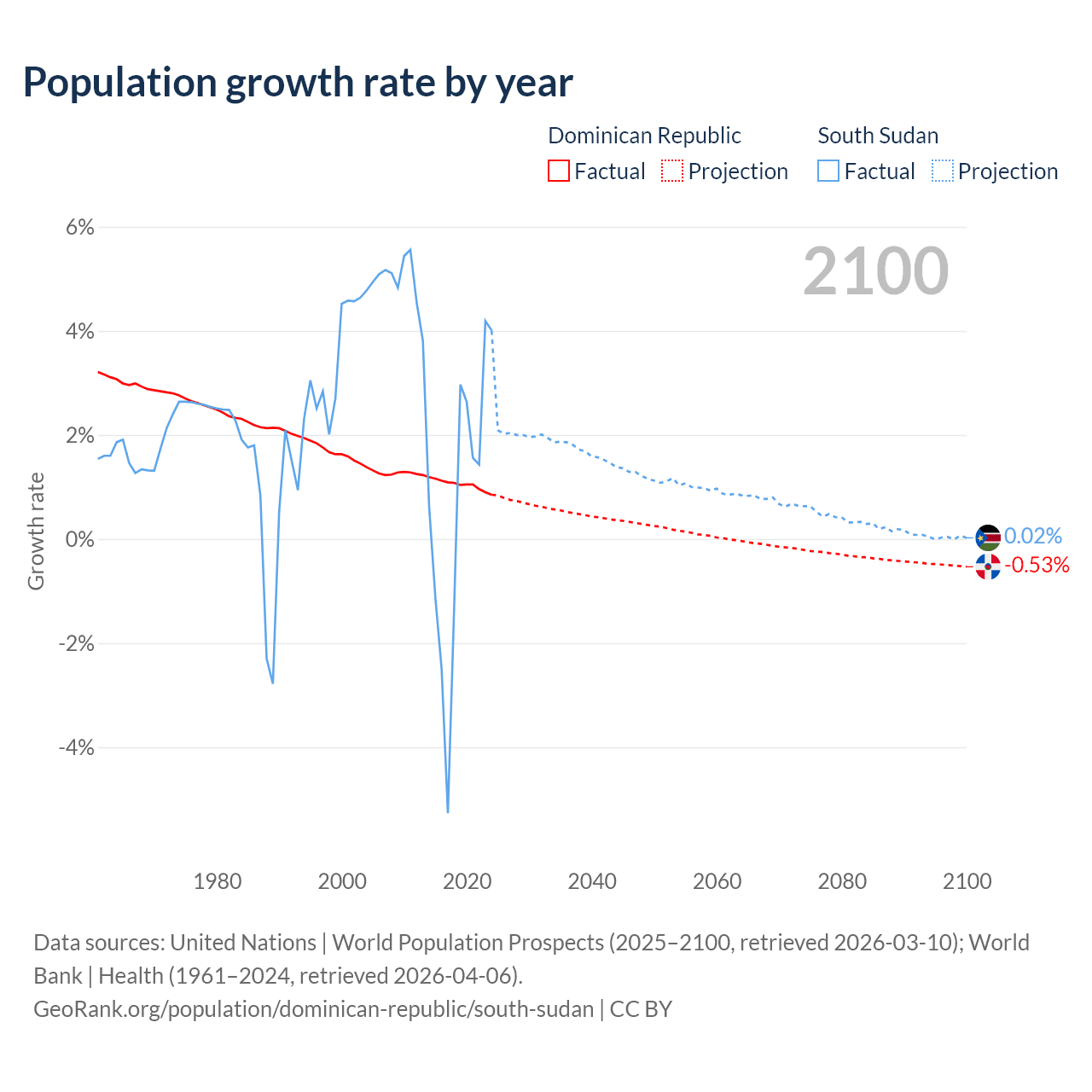 - For the last 10 years, the Dominican Republic has had an average growth rate of +1.04% per year vs +0.65% in South Sudan.
