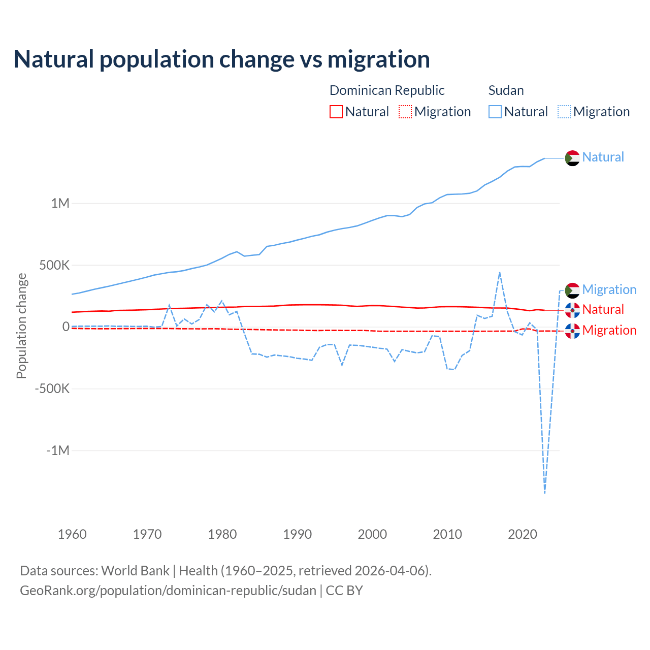 Over the last 10 years, 81.8% of the population change in the Dominican Republic is from natural causes (a gain of 1,447,764 people) and 18.2% is from migration (a loss of 322,919 people). In Sudan 95.1% is from natural causes (a gain of 12,459,977 people) and 4.88% is from migration (a loss of 639,596 people).